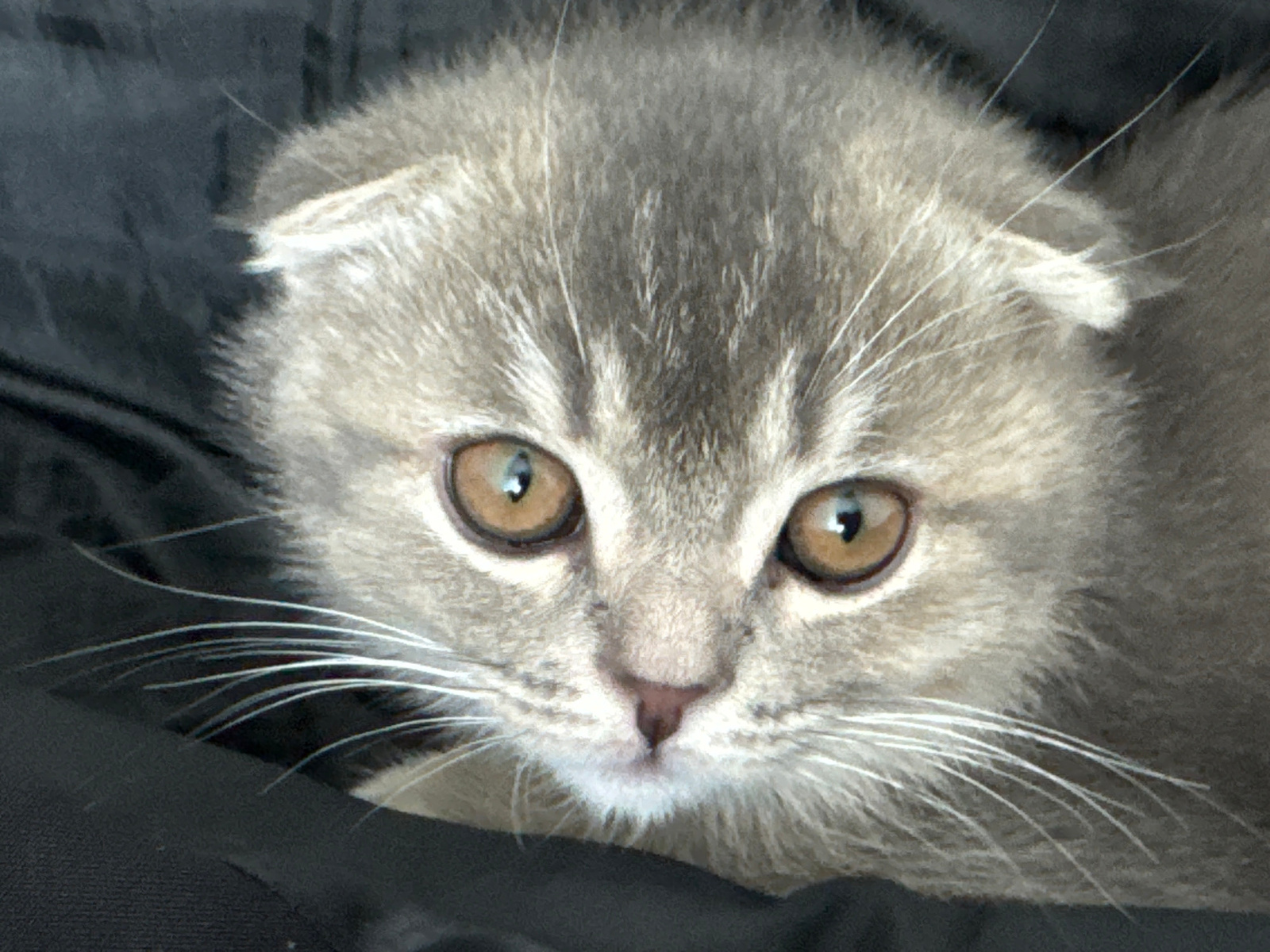 A close-up shot focuses on a grey, fluffy kitten. The kitten has golden-brown eyes and folded ears. Its fur appears soft and its white whiskers are prominently displayed against its grey coat. The kitβ¦read more