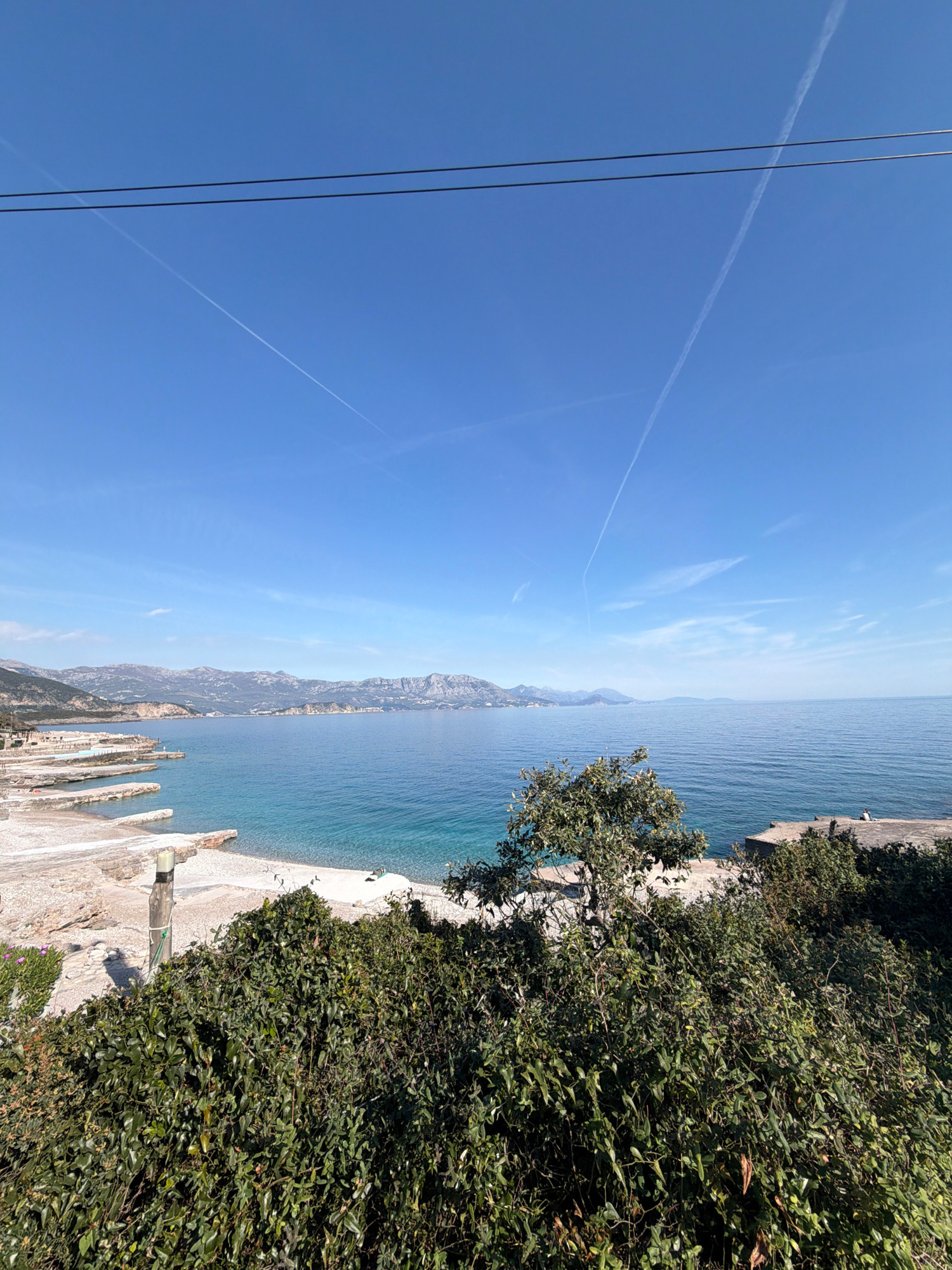 The image presents a view from an elevated position in Dubraljevina, Montenegro, overlooking the Adriatic Sea. To the right, the coastline is defined by dense green vegetation covering the rocky terra…read more