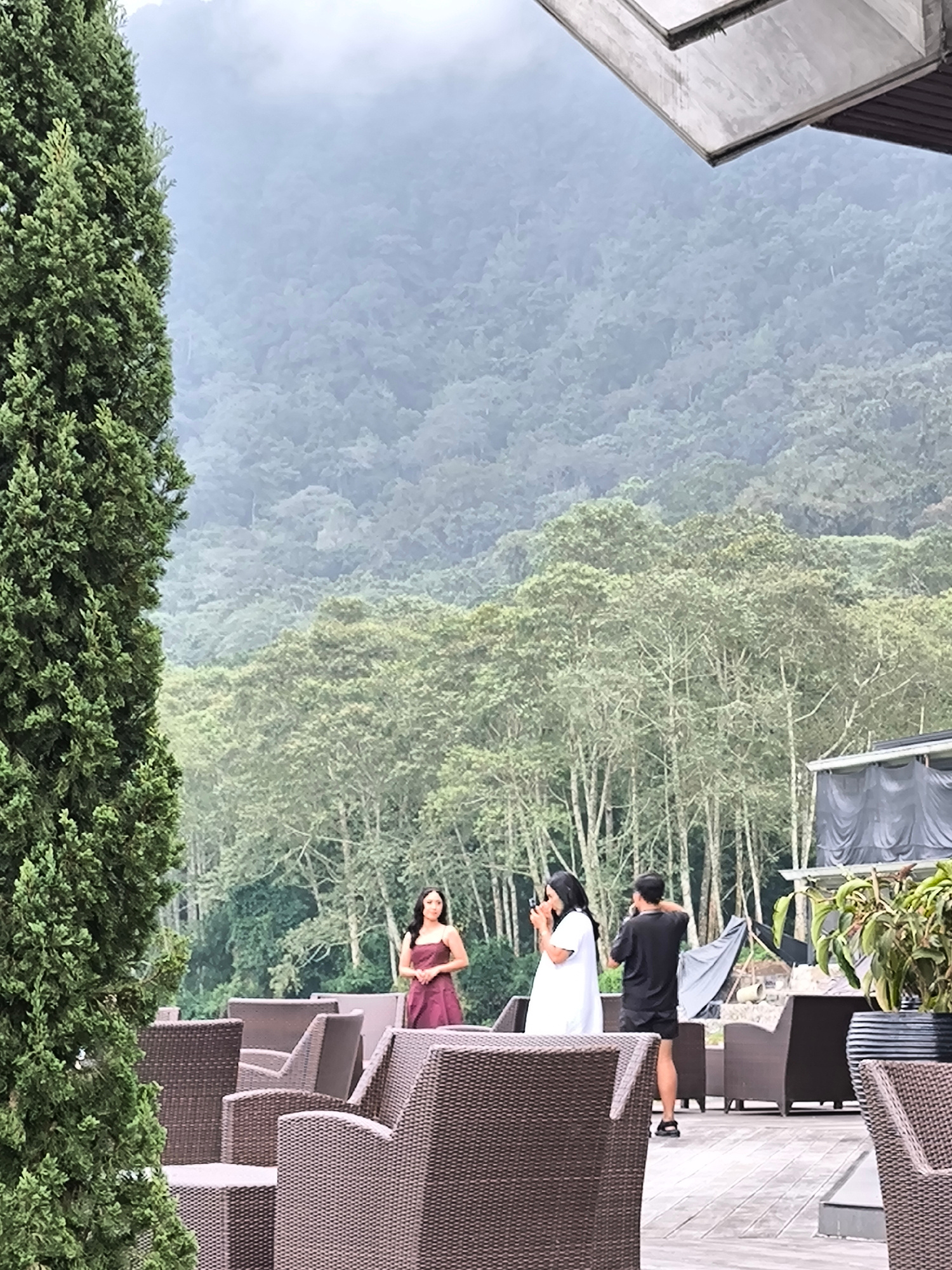 The image depicts an outdoor scene in Sukasada, Indonesia. Three people are present: a woman in a maroon dress, a woman in a white dress holding a phone, and a man in a black shirt and shorts. They ap…read more