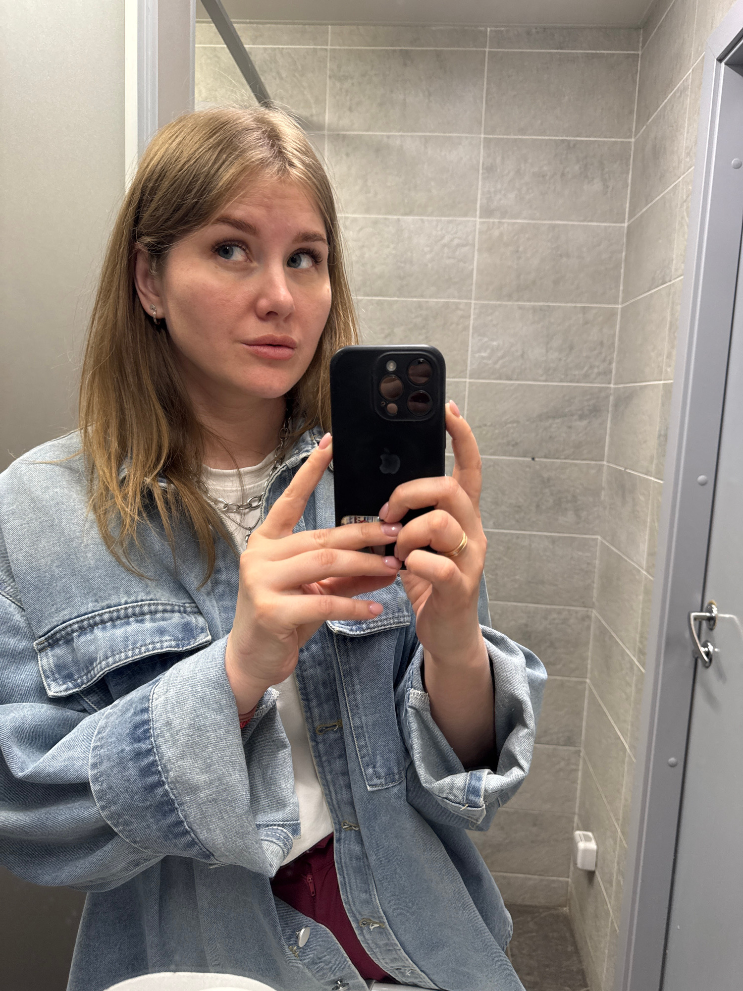 A young woman is taking a selfie in a bathroom. She is holding a black smartphone with multiple lenses and looking at the camera with a neutral expression. She has blonde hair and is wearing a denim j…read more