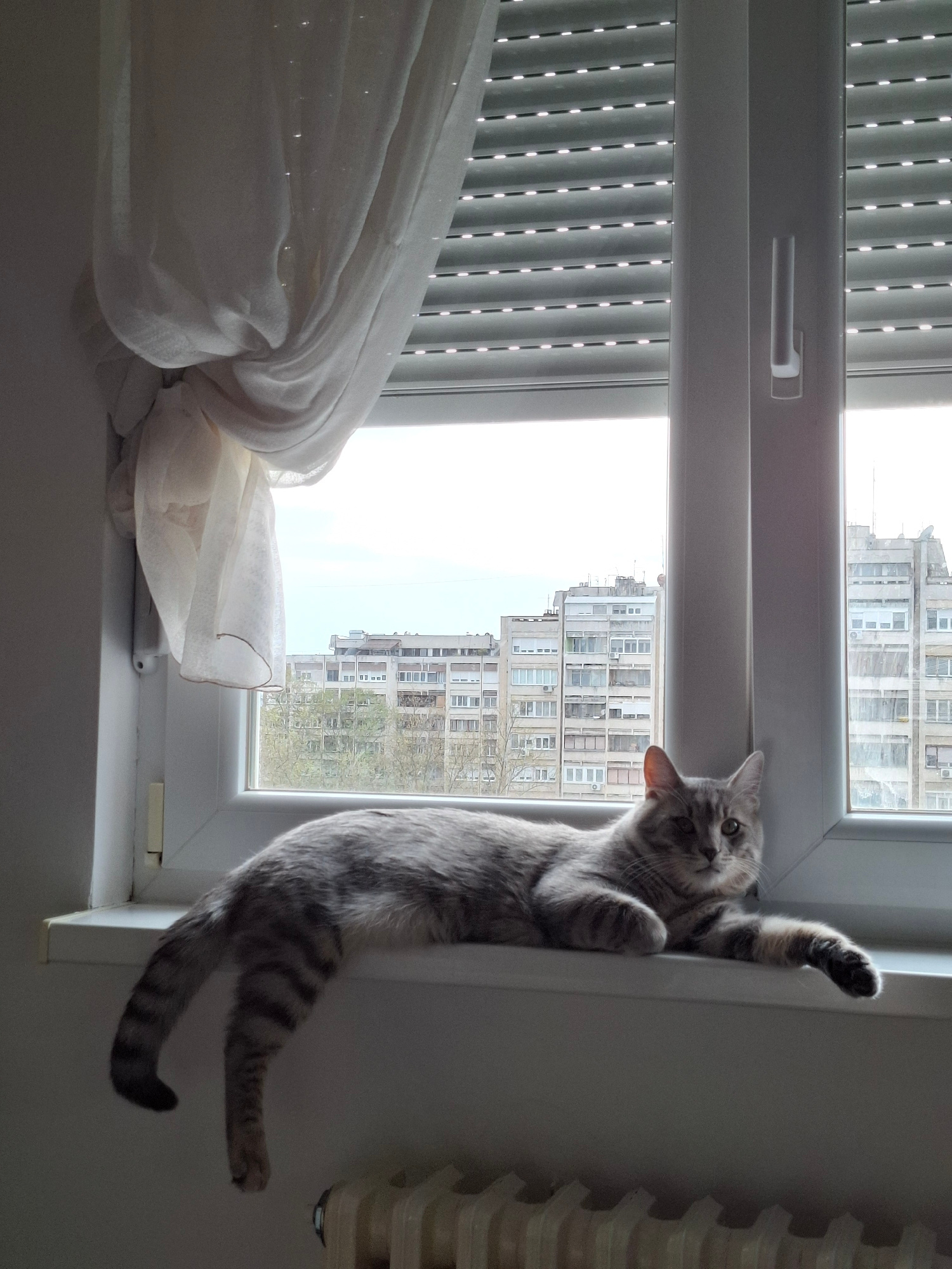 A gray tabby cat hangs vertically on the right side of a white window frame. The cat is grasping the frame with its right paw while its body extends downward. Its tail is extended and bent upwards at…read more
