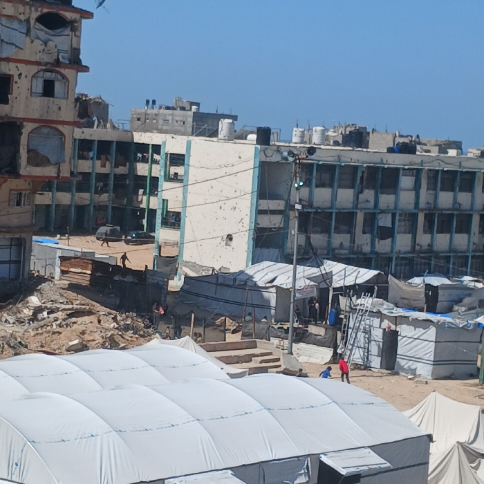 The image displays an urban landscape in the city of Gaza, Palestinian Territory, under a clear blue sky. In the foreground, multiple large, white, interconnected tent structures are visible. The mid…read more