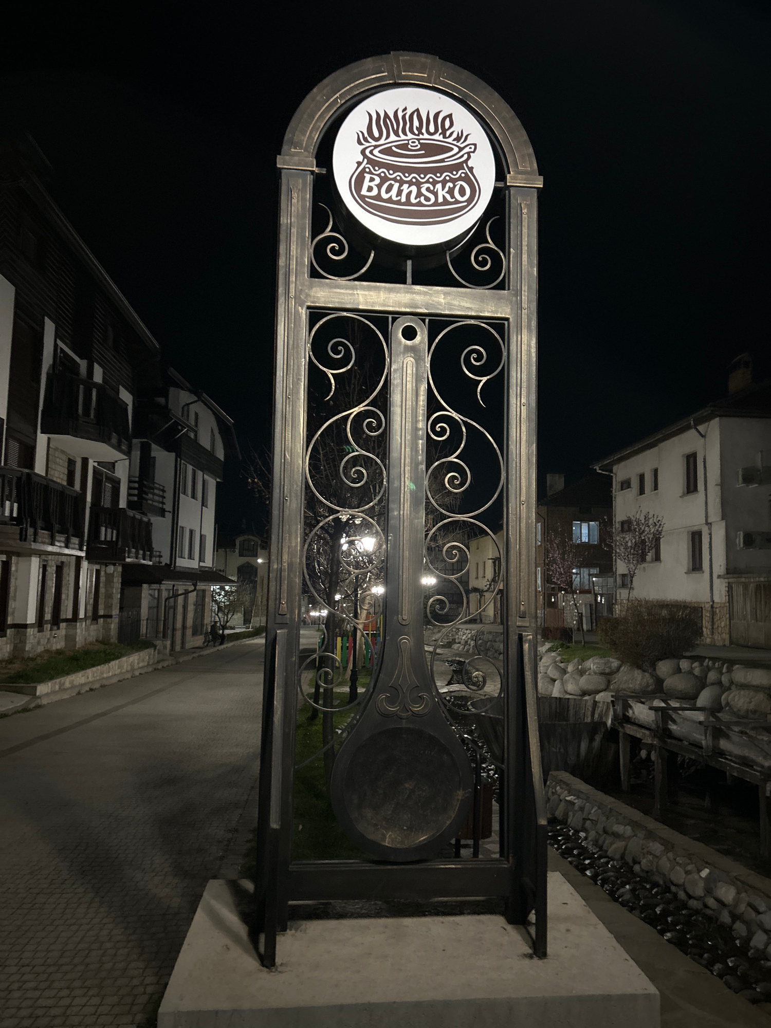 A vertical shot showcases a decorative sign in Bansko, Bulgaria, at night. The sign, crafted from wrought iron, features an ornate frame enclosing a large, stylized wooden spoon. A circular sign at th…read more