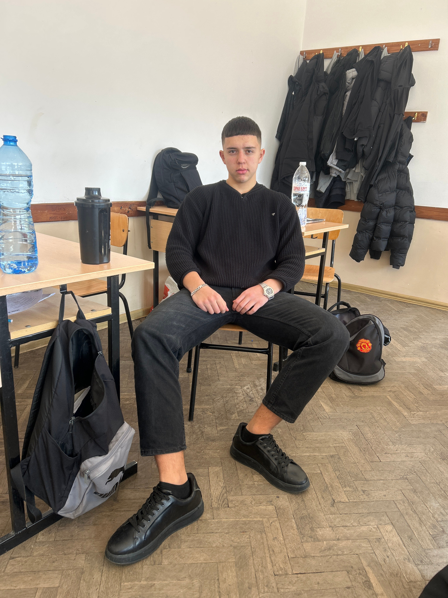 An interior image taken in a classroom in Zlatograd, Bulgaria, shows a young male seated on a chair at a wooden student desk, looking directly at the camera. The male, appearing to be a teenager or yo…read more