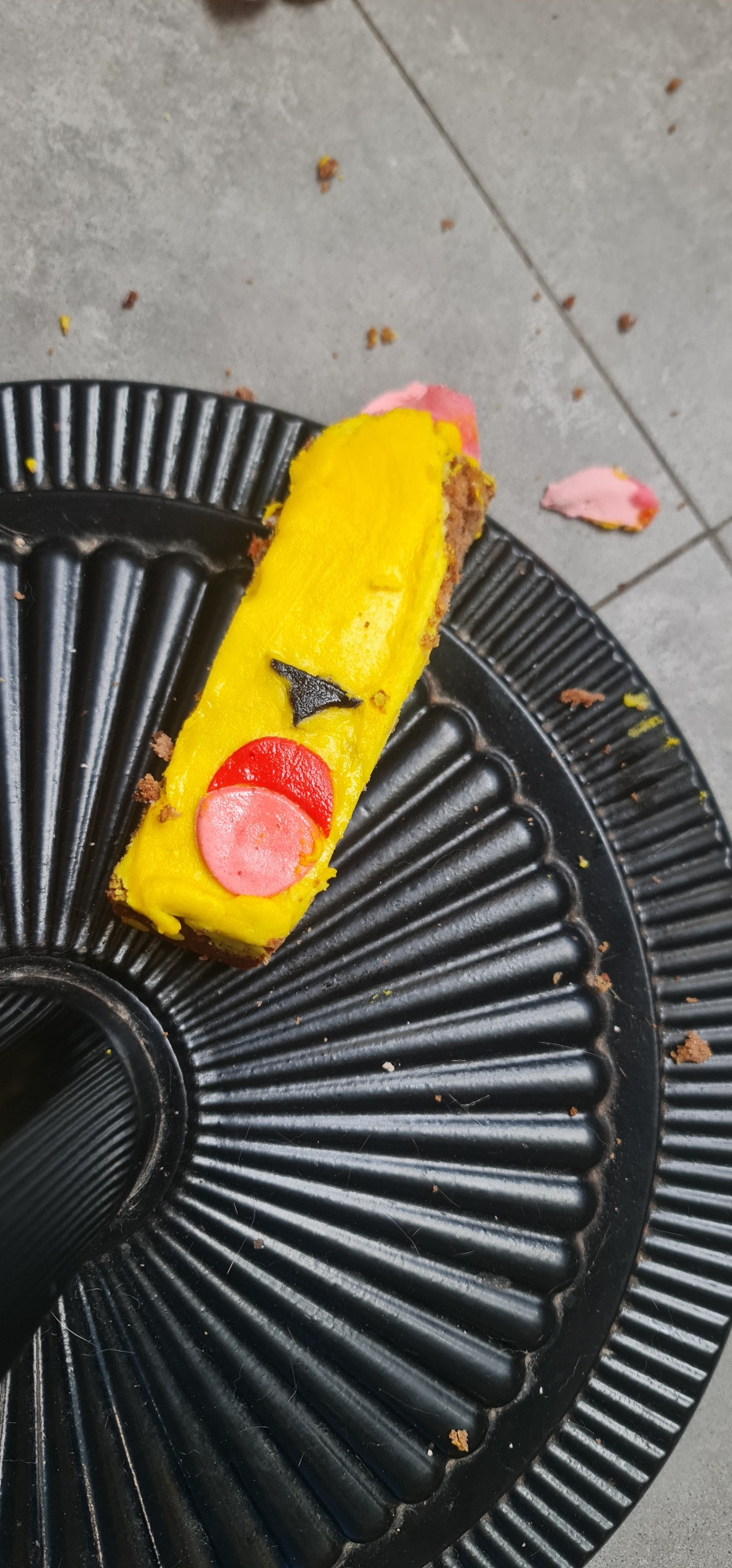 A partially eaten pastry resembling Pikachu lies on a black, ridged plastic plate. The pastry has a yellow frosting with a black triangle representing an eye and a red and pink circle for the cheek. The plate sits on a gray tiled surface. Debris from the pastry is scattered around the plate and on the tiled surface. No people are visible in the image. Đà Nẵng, Vietnam is not explicitly indicated but can be inferred from context (location data). | Open Wire