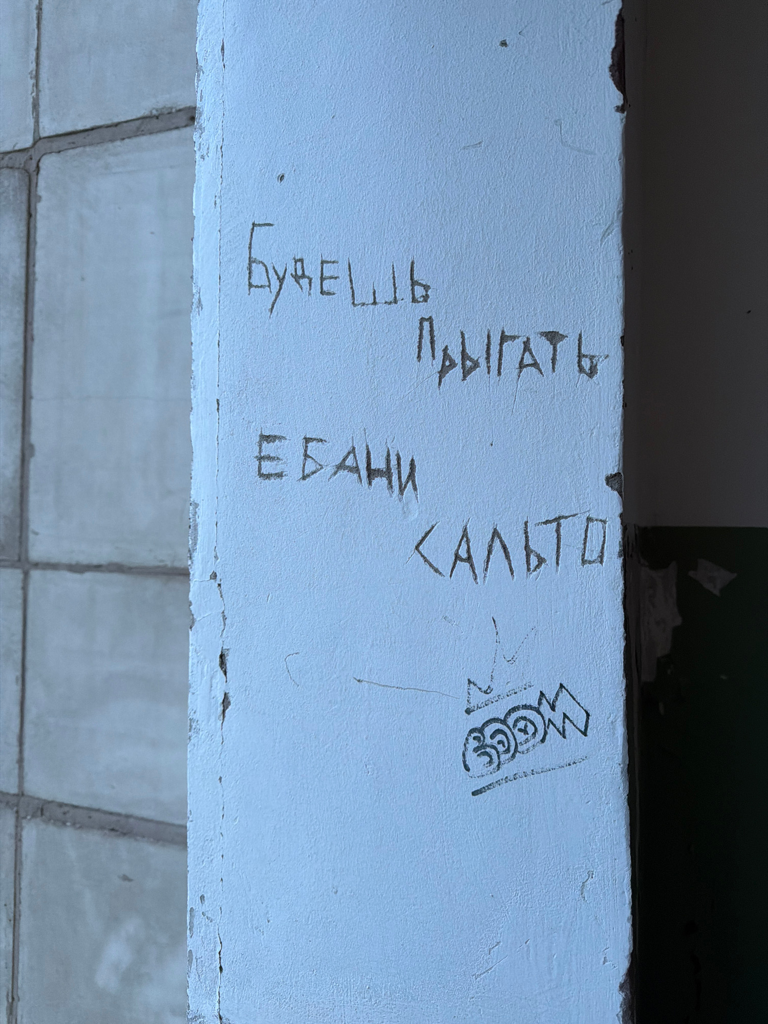 The image displays a light blue or off-white painted concrete pillar or wall segment located in Chaikovsky, Russia. The painted surface exhibits wear, chipping, and vertical cracks. Engraved or scratc…read more
