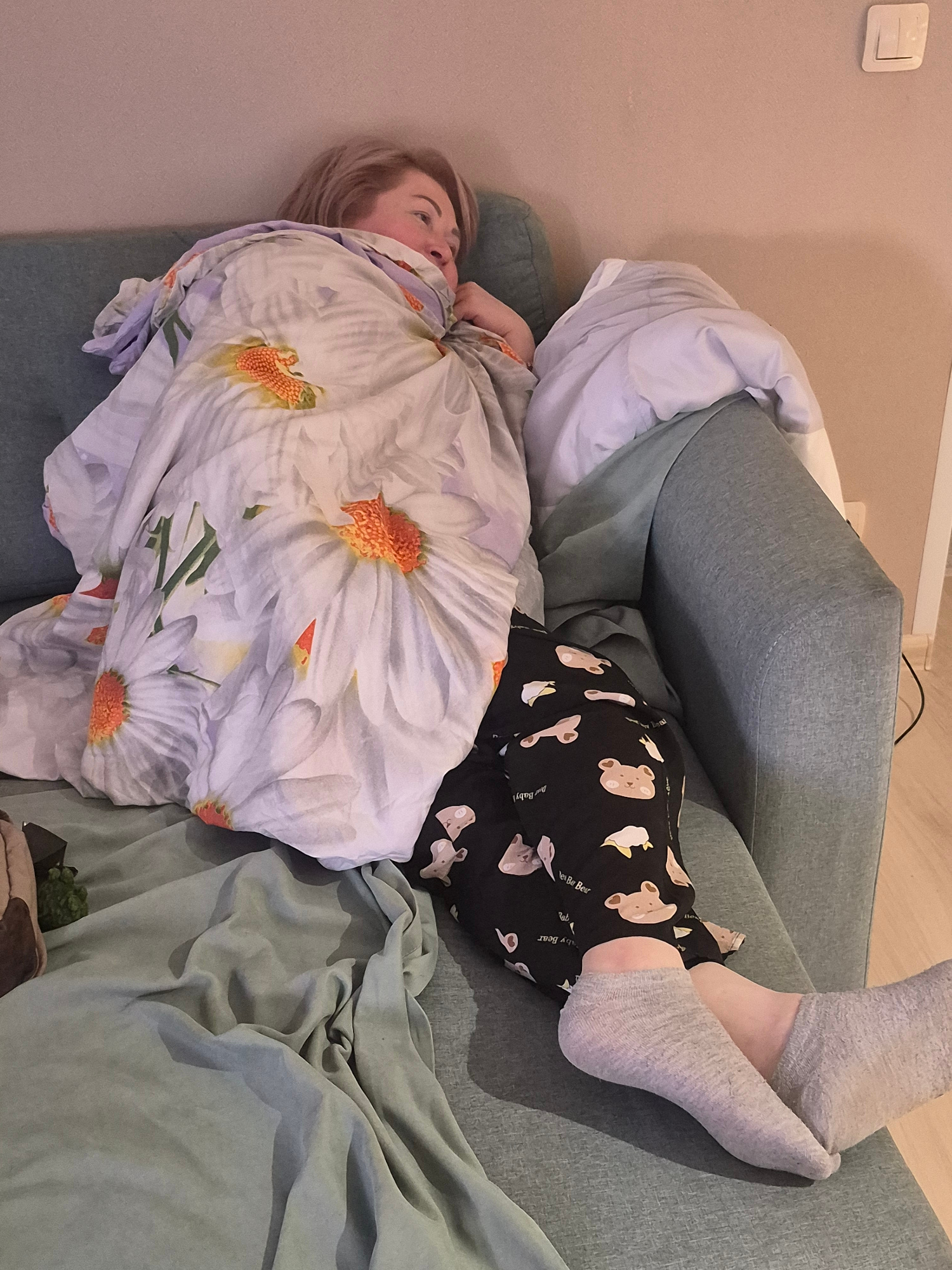 A person lies on a light green couch, covered with a floral-patterned blanket. The person wears gray socks and black pajamas with a white bear design. Part of a white pillow and a light gray cushion a…read more