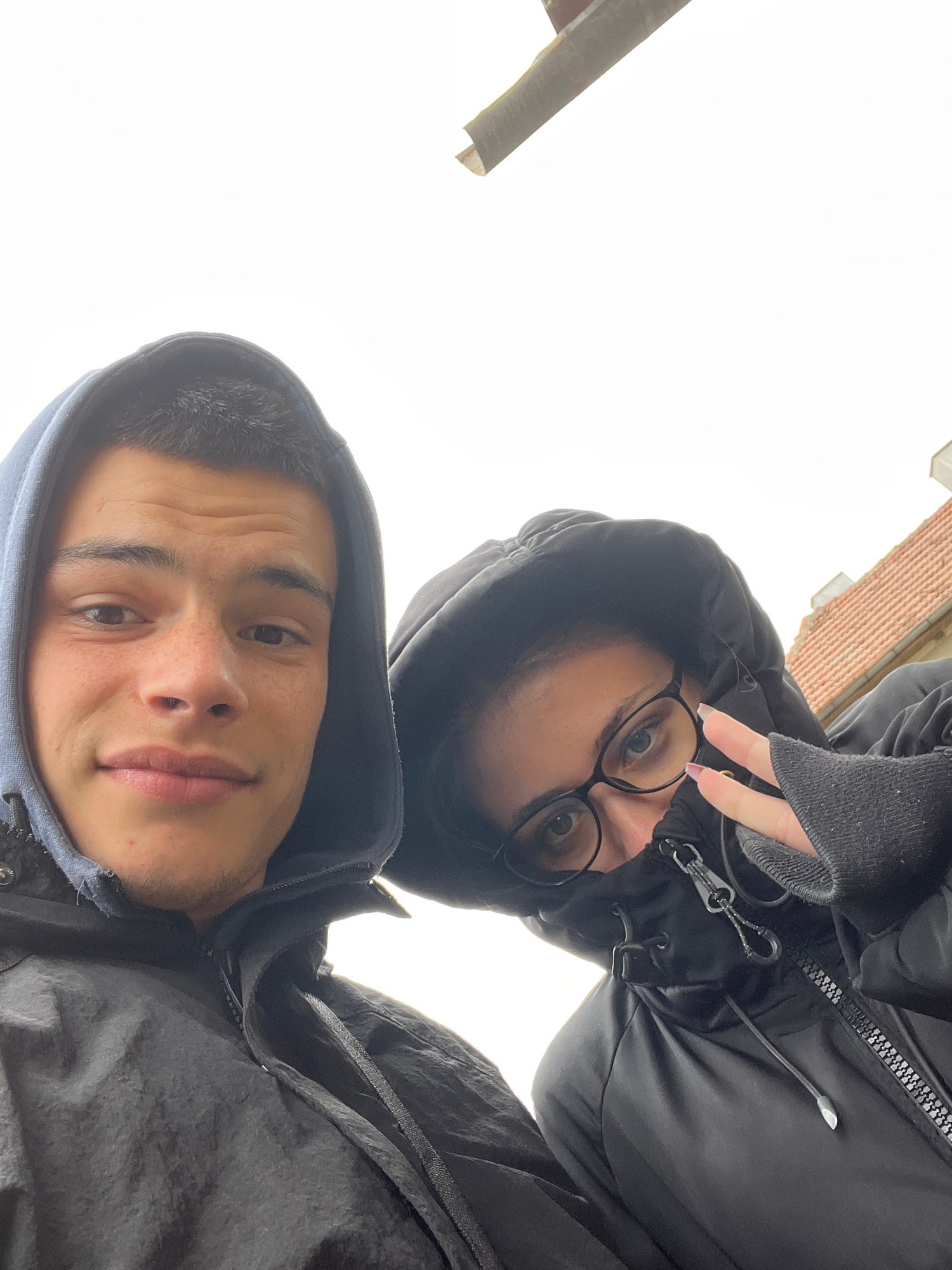 A low-angle selfie shows two people wearing hooded jackets. The person in the foreground is a young man with short dark hair. He is wearing a blue hoodie. Behind him is a young woman with glasses and…read more