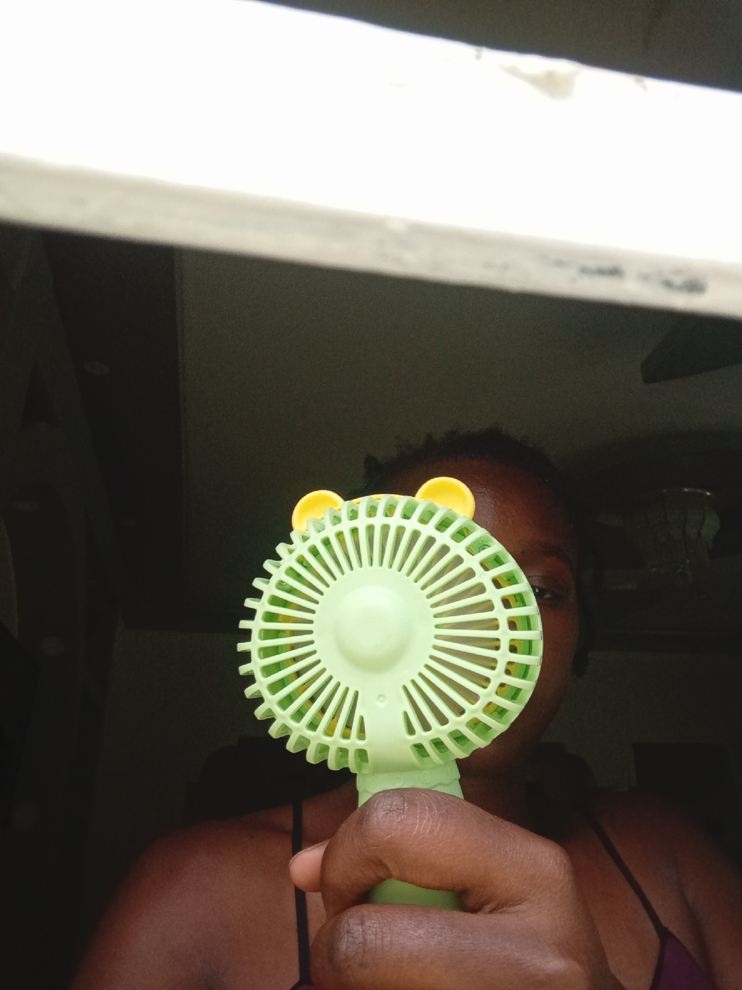 A person is holding a green and yellow fan in front of their face, obscuring most of their features. Only one eye and a portion of their forehead are visible. The person has dark skin and short, curly…read more