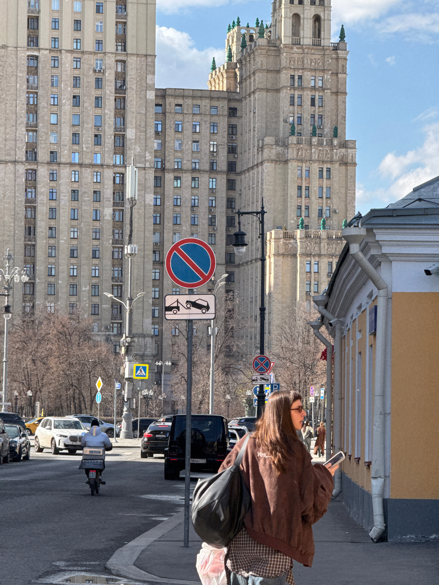The scene is set in Moscow, Russia, and features a street with a prominent Soviet-era skyscraper in the background. A woman is looking at her mobile phone and holding it with her right hand. She is we…read more