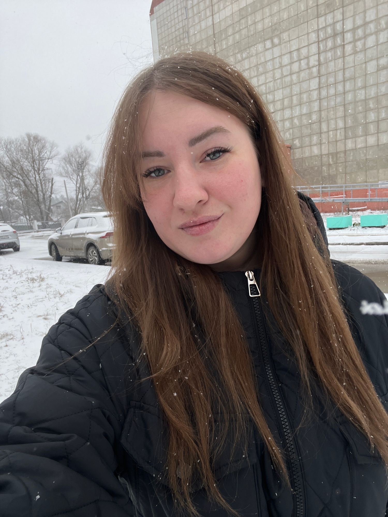 A woman with long brown hair and blue eyes is wearing a black puffer jacket outdoors in snowy conditions. Snowflakes are visible on her hair and clothing. In the background, there is a snow-covered pa…read more