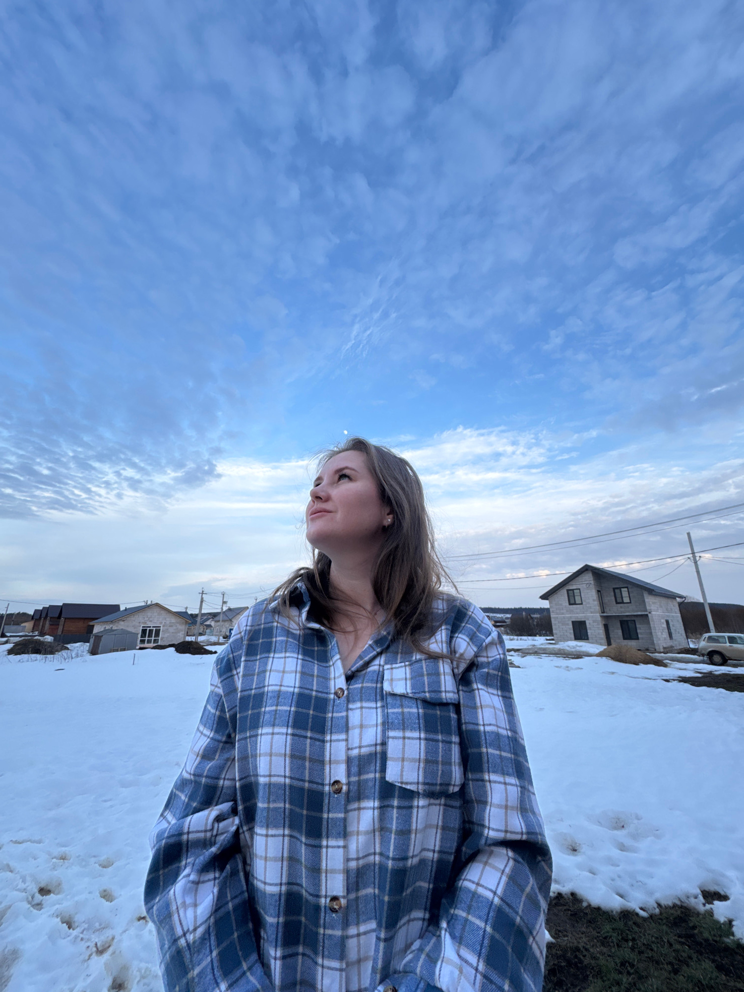 The image shows a young woman standing in the snow in what appears to be a residential area. She is wearing a blue and white plaid shirt. The sky is cloudy. In the background, there are houses and pow…read more