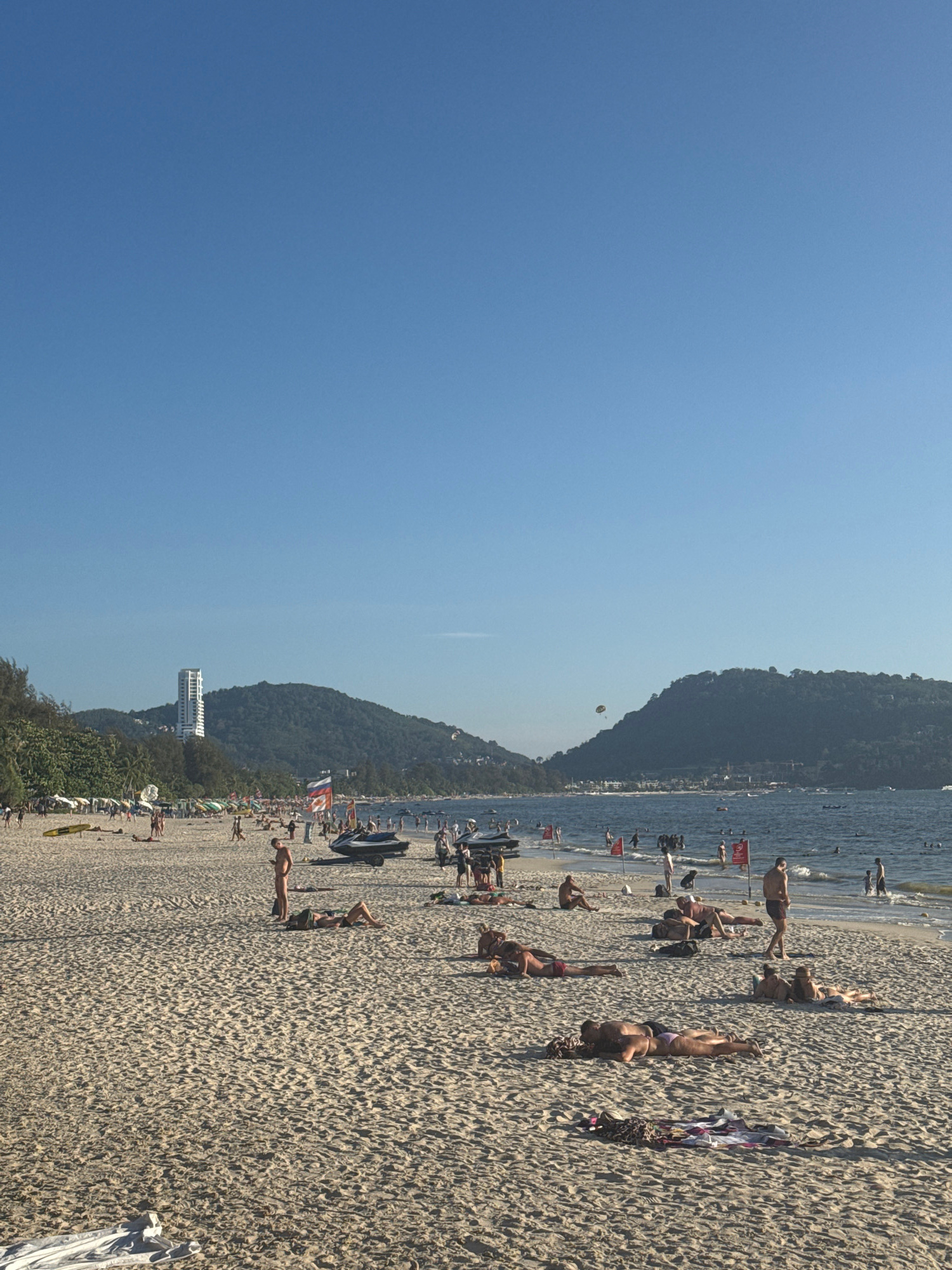 The image captures a sunny day at Patong Beach in Thailand. The scene includes a wide sandy beach with numerous people sunbathing, swimming, and relaxing. A body of water borders the beach, with boats…read more