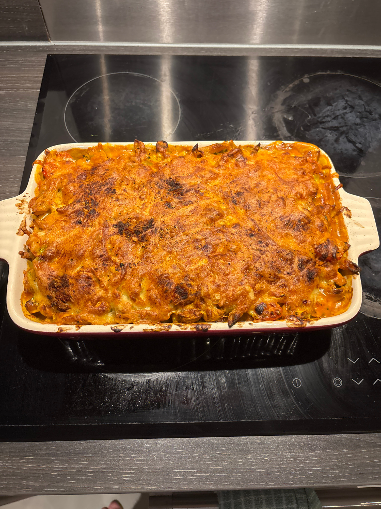 The image shows a freshly baked dish in a rectangular ceramic baking pan. The dish appears to be a casserole or lasagna, with a browned and slightly charred cheese topping. The pan has a cream-colored…read more