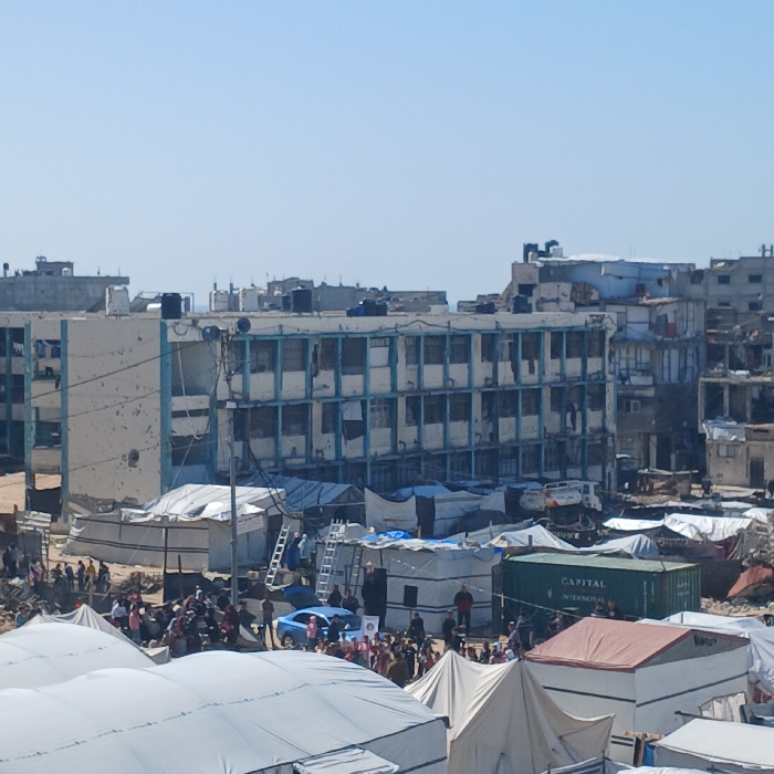 The image presents an extensive, densely populated encampment within the city of Gaza, Palestinian Territory, under a clear blue sky. In the background, multiple multi-story concrete buildings exhibit…read more