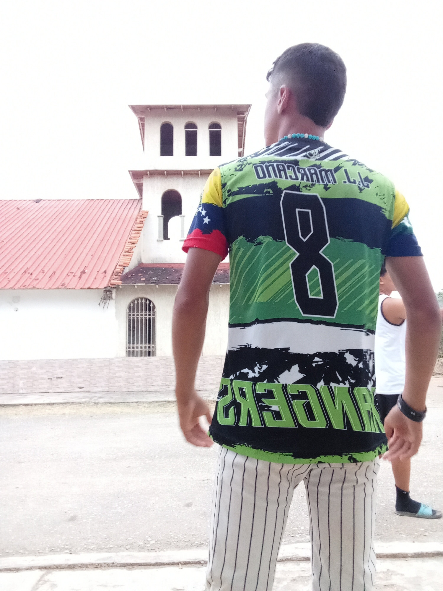 A young man is depicted from the back, standing outdoors and looking towards a white building with a distinctive red tiled roof. The building features a tower with multiple arched windows, suggesting…read more