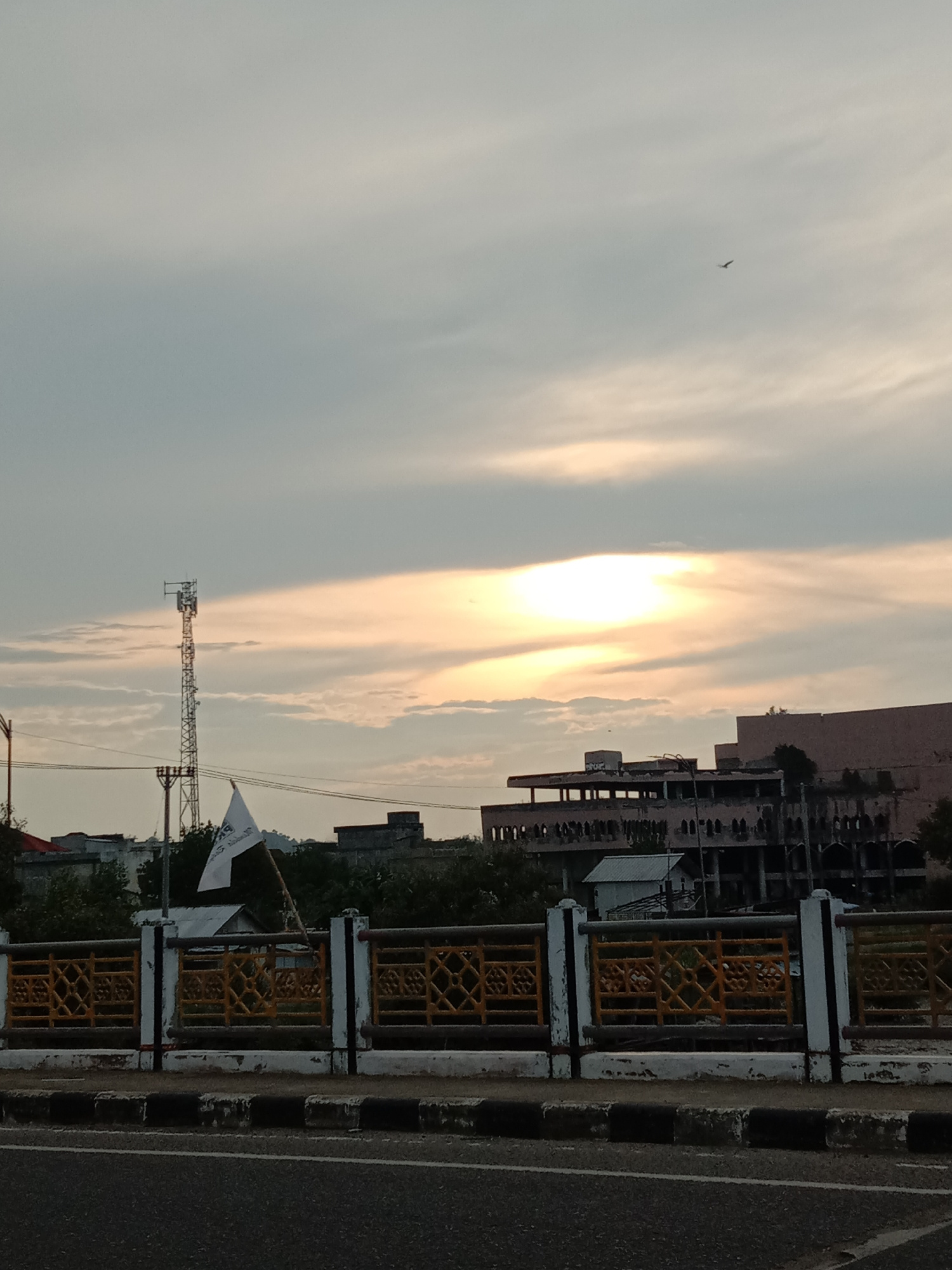 The photograph captures a cityscape in Lhokseumawe, Indonesia, under a sky with sunlit clouds. The view is taken from what appears to be an elevated position, likely a bridge, judging by the road and…read more