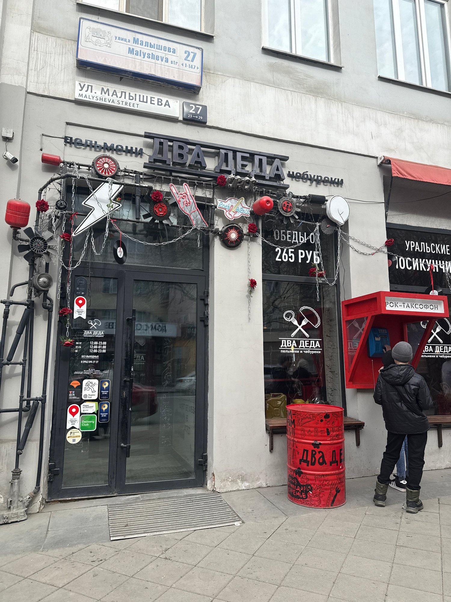The image shows the facade of a restaurant named "Dva Deda" (Two Grandfathers) in Yekaterinburg, Russia. The restaurant is located at 27 Malysheva Street. The entrance is decorated with industrial-the…read more