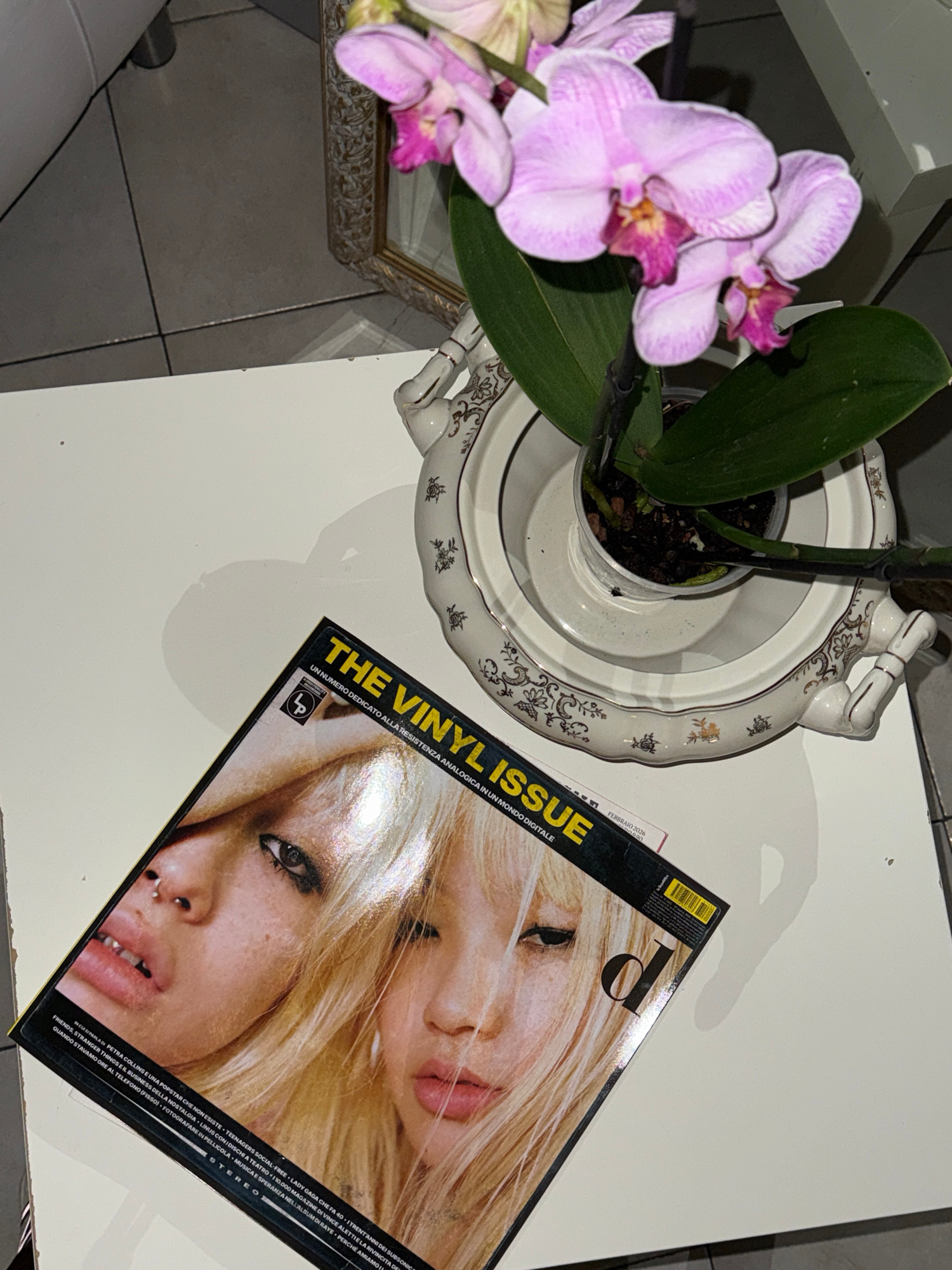 A high-angle indoor shot depicts a white, square table with several items on it. To the left is a purple orchid plant in a white ornamental planter set on a patterned base. To the right is an Italian…read more