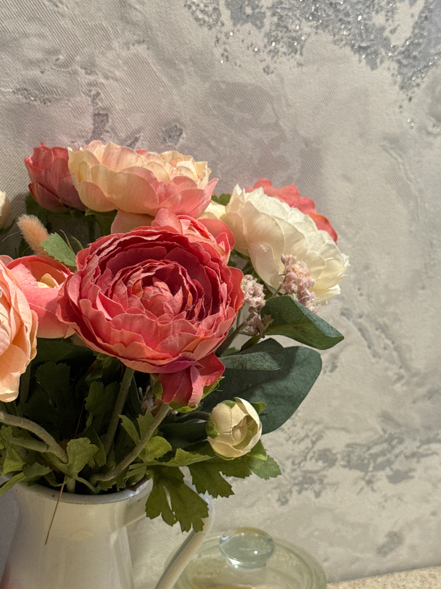 A still-life photograph shows a bouquet of artificial flowers in a white vase. The bouquet consists of several blooms in shades of pink, peach, and cream, with green leaves and stems. The main flower…read more