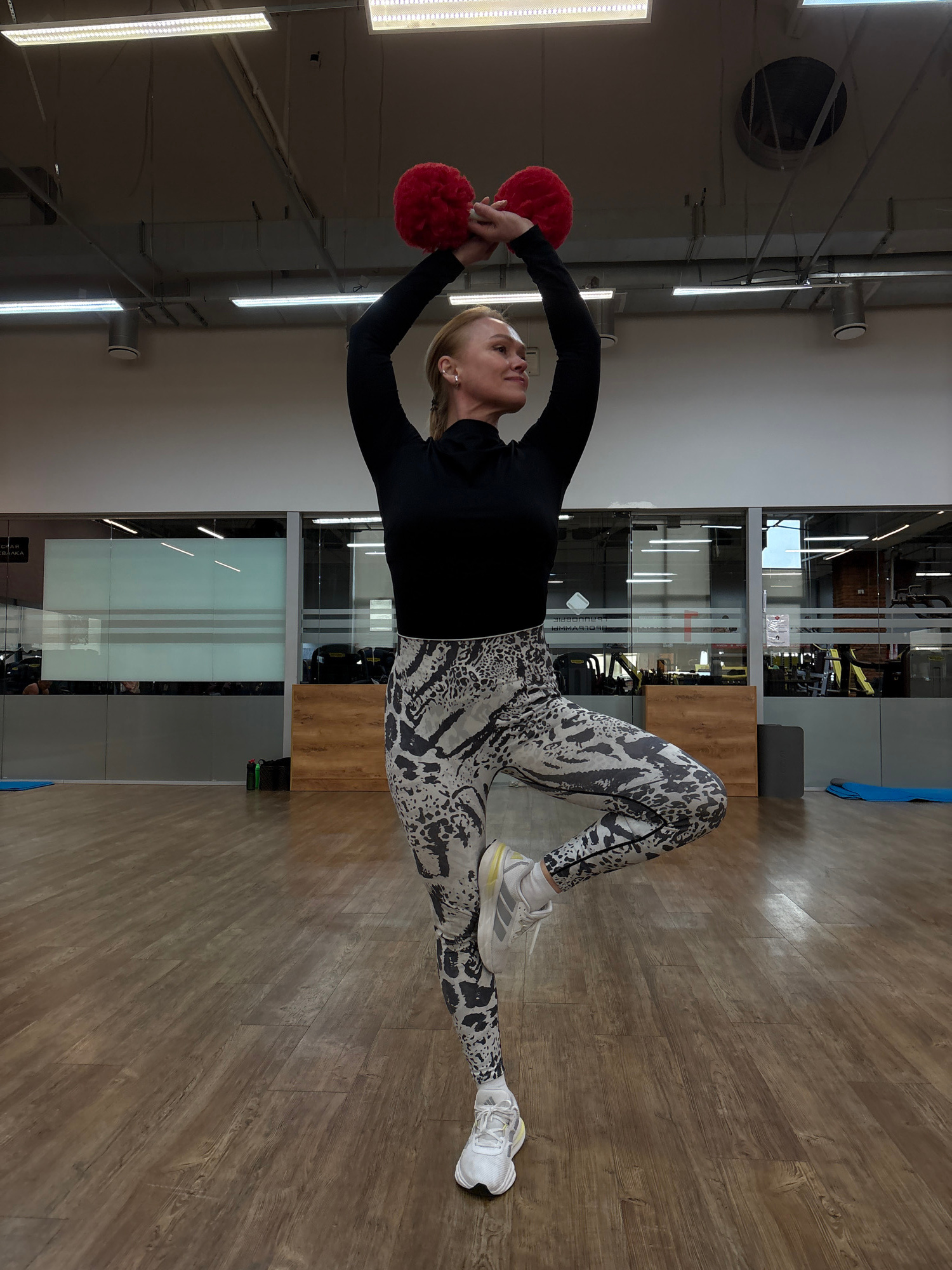 A woman is lying on a wooden floor in a gym in Chaikovsky, Russia. She is wearing a black long-sleeved shirt and patterned leggings, as well as white athletic shoes. She is holding two red, pom-pom-li…read more