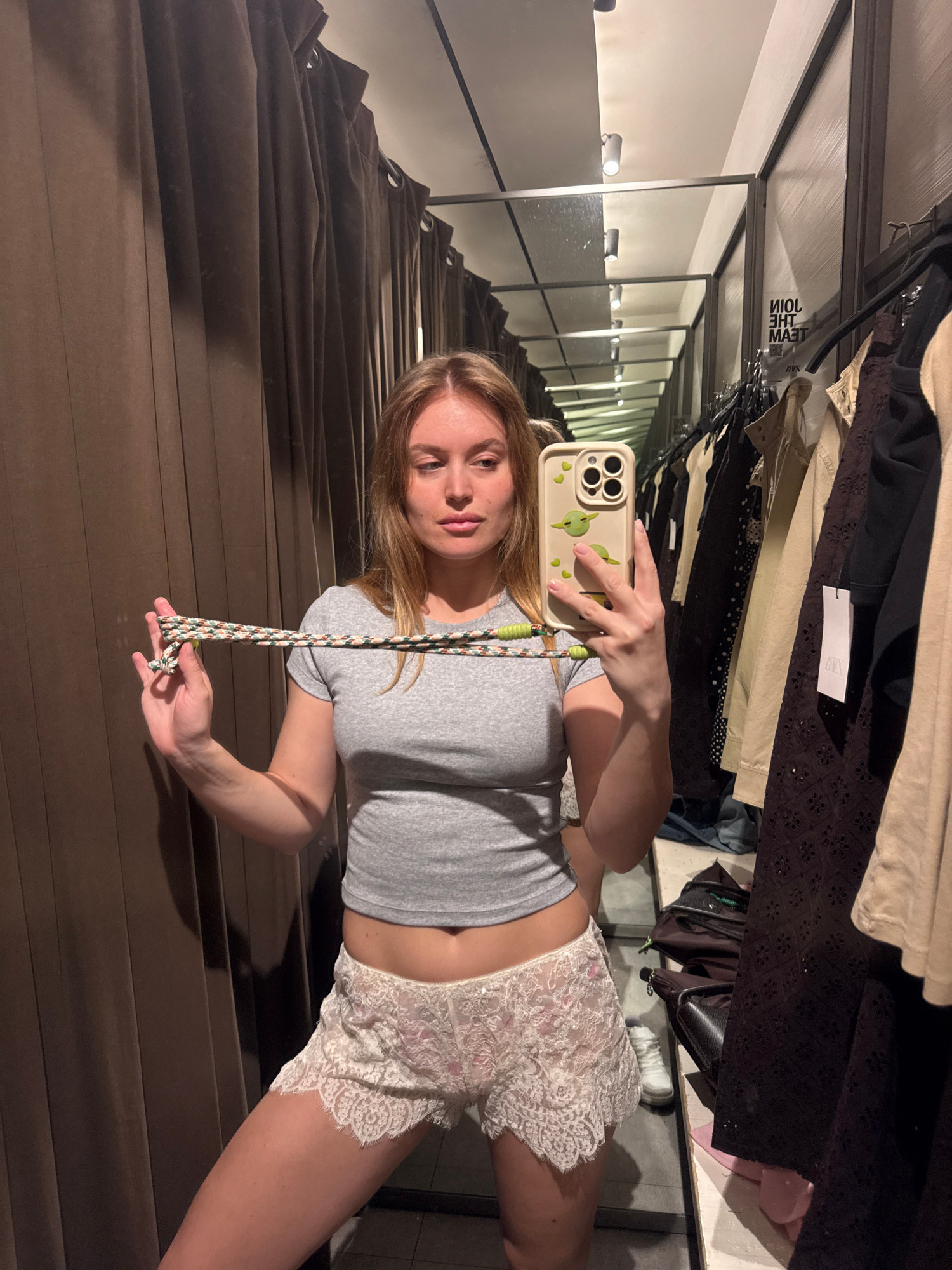 A young woman is taking a selfie in what appears to be a fitting room. She is wearing a gray short-sleeved shirt and white lace shorts. She is holding her phone in her right hand, and there is a lanyaβ¦read more