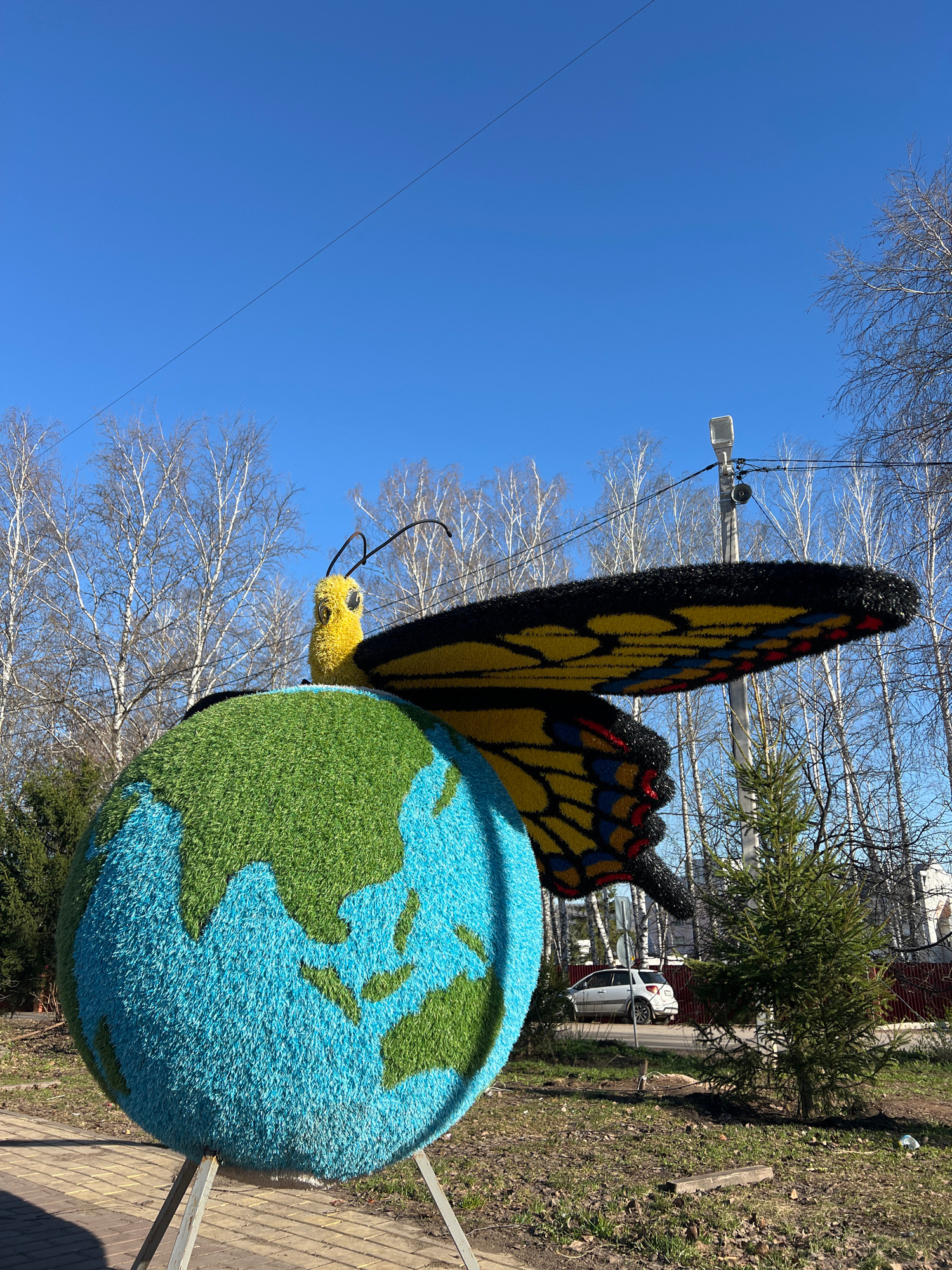 An outdoor scene in санатория Юматово имени 15-летия БАССР, Russia, features a decorative display. A large, spherical representation of the Earth, covered in blue and green fiber, rests on a stand. A…read more