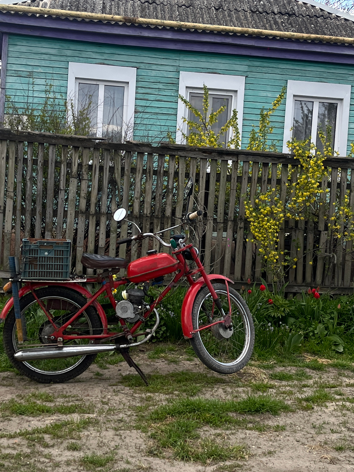 A red moped stands on a dirt and grass area in front of a wooden fence, with a blue and green building visible in the background. Yellow flowers are growing on the fence. Red flowers are also visibleβ¦read more