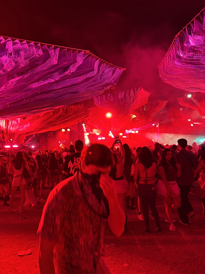 Here is a description of the image: The image shows a crowd of people at what appears to be an outdoor event, possibly a music festival, in Indio, United States. The scene is lit with bright red and…read more