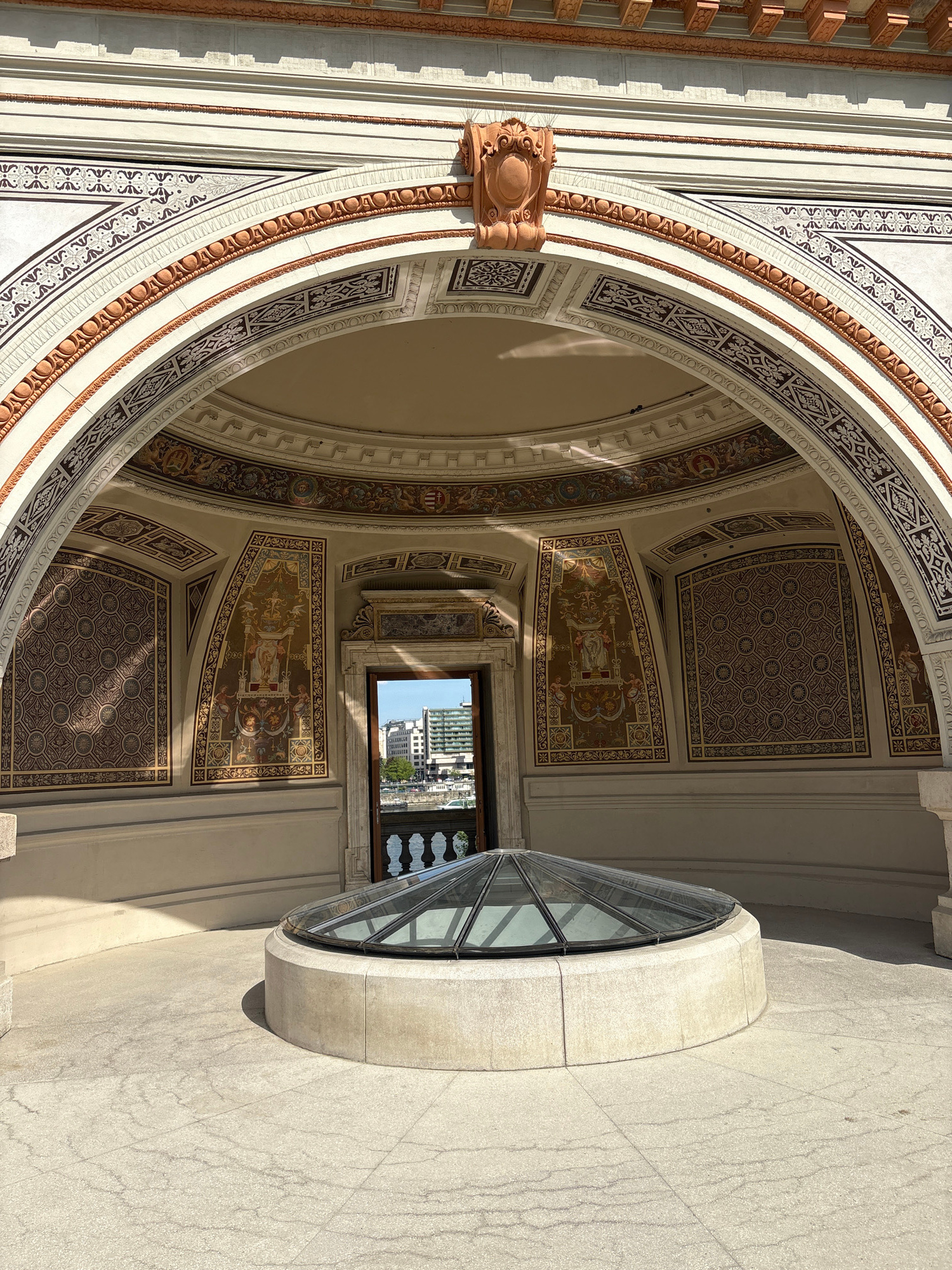 The image shows an ornate arched doorway and a round window in Budapest, Hungary. The view is from beneath the arch, looking through a smaller rectangular window into the cityscape. The arch is decora…read more