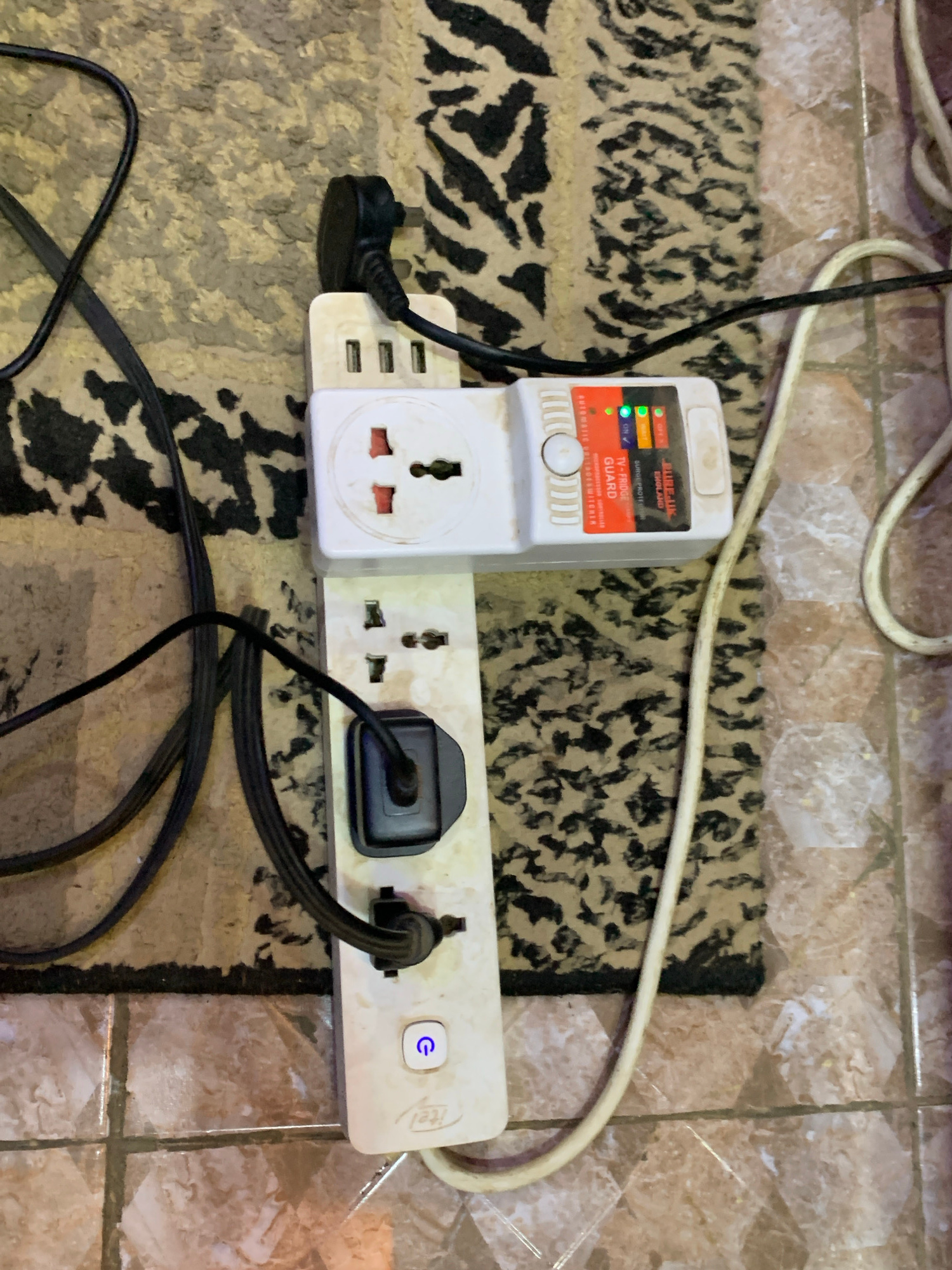 The image shows an electrical setup on a tiled floor covered with a patterned rug. The setup includes a white power strip with multiple outlets and a surge protector labeled "TV-FRIDGE GUARD" with ind…read more