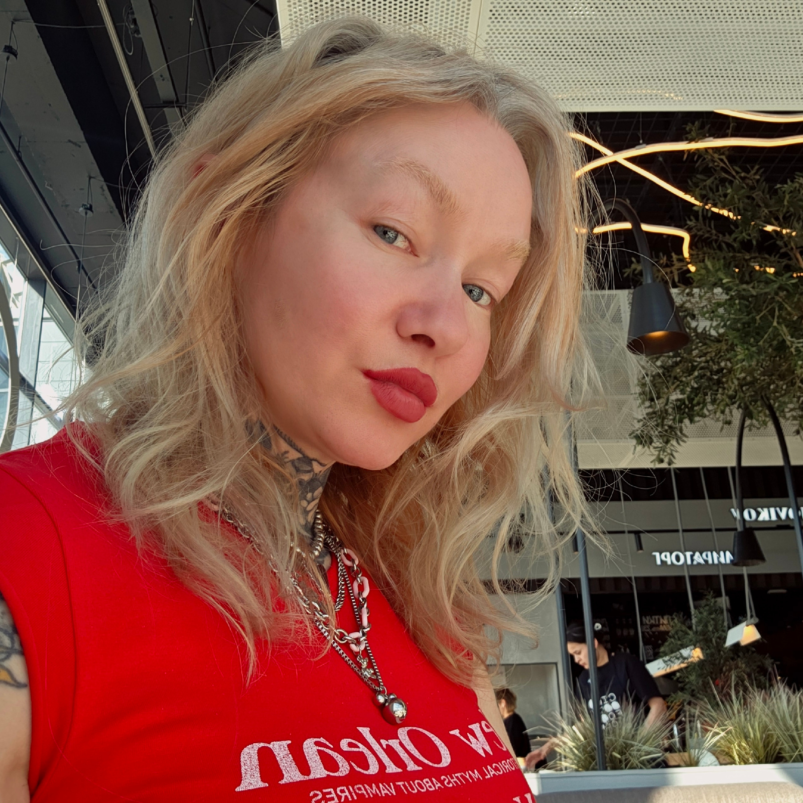 A portrait-oriented photo captures a fair-skinned person with long, wavy blonde hair and blue eyes, looking directly at the camera. The person is wearing vibrant red lipstick and a red top. A silver c…read more