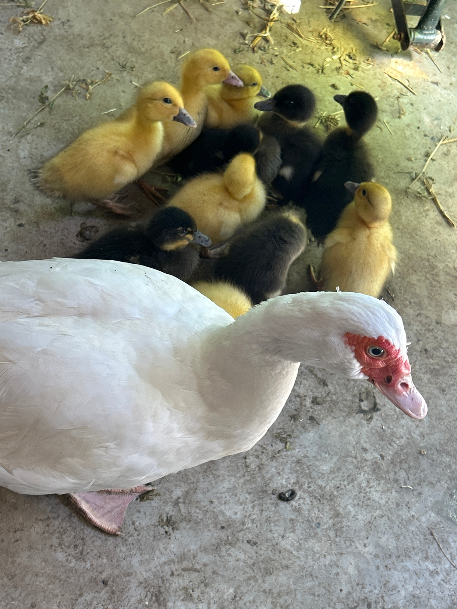 A white Muscovy duck with prominent red caruncles around its left eye and a pink beak occupies the lower left of the frame, facing towards the right. A pink webbed foot is visible beneath its body. To…read more