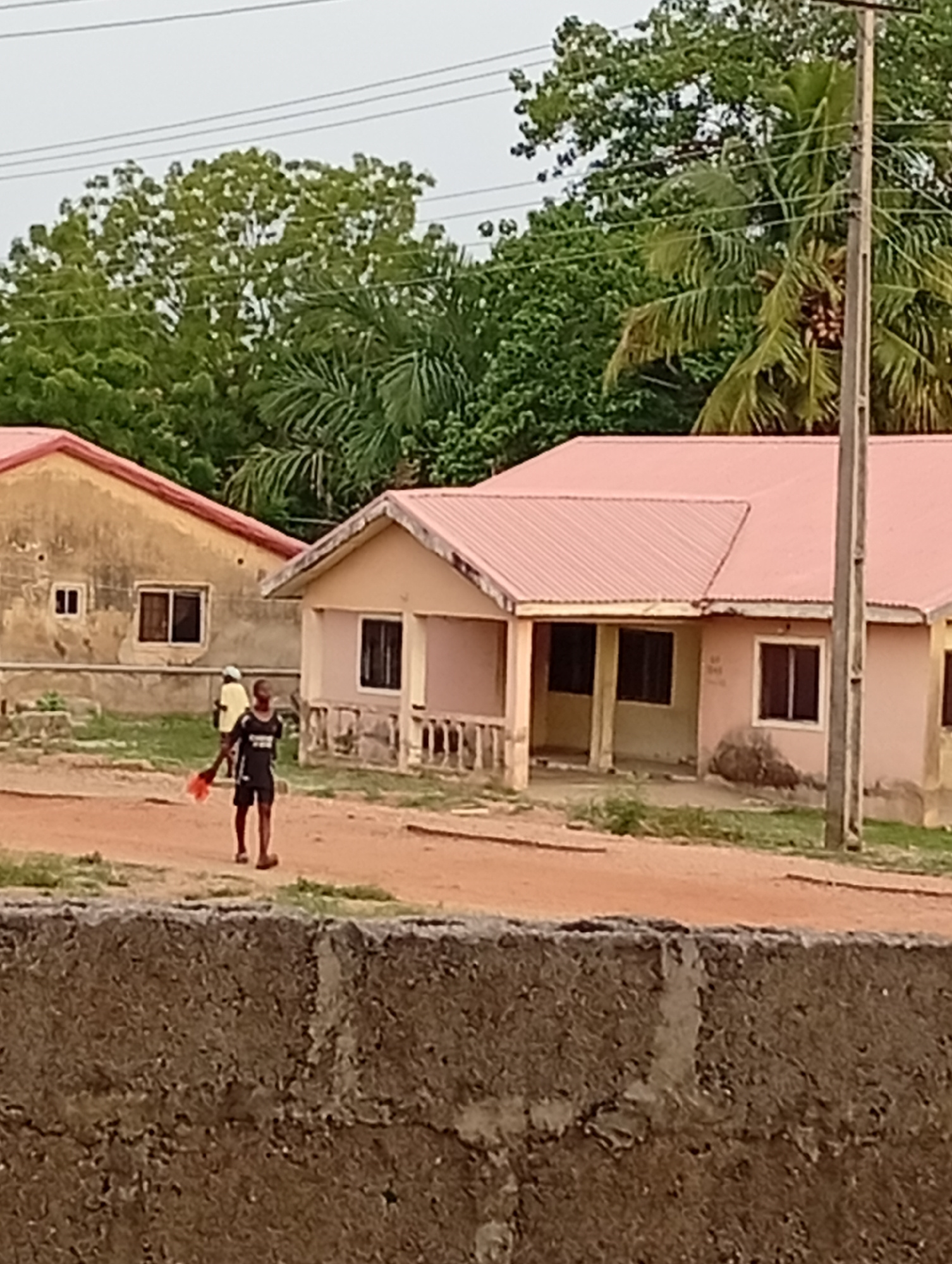 The image depicts a street scene in Adankolo, Nigeria. A young person in a black athletic outfit walks along a red dirt road, holding what appears to be a red cloth or item. Behind them, another perso…read more