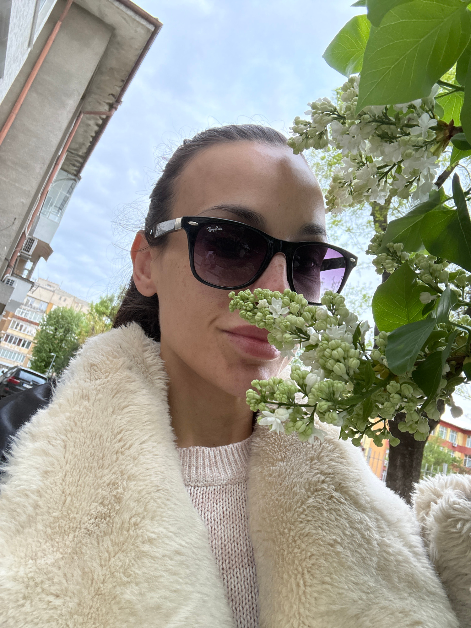A close-up, rotated portrait captures a person outdoors, framed by white lilac flowers and green leaves. The subject's head is tilted, and they are wearing dark "Ray-Ban" sunglasses. Part of their fac…read more