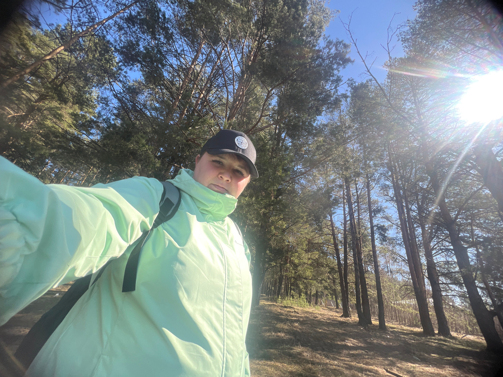 A person wearing a light green jacket and a dark baseball cap is pictured in an outdoor setting with tall trees and a blue sky. The location is possibly a forest or wooded area. The photo appears to b…read more