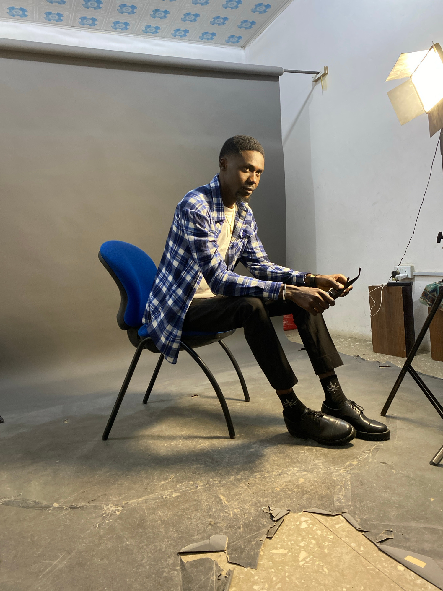 A man sits on a blue and black office chair in what appears to be a photography studio in Jos, Nigeria. He is wearing black pants, black shoes, black socks with white designs, and a blue and white pla…read more
