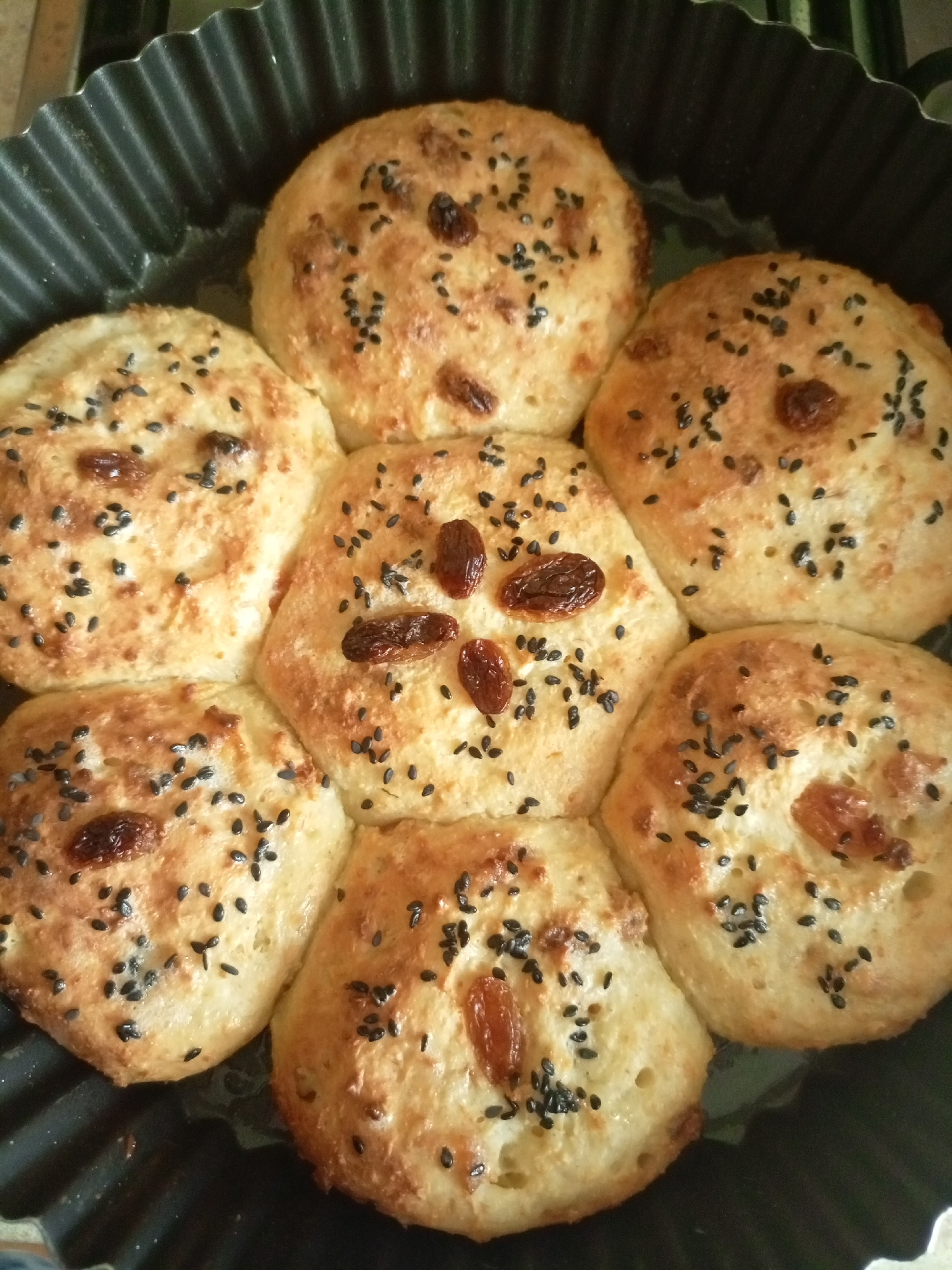 A close-up, high-angle shot shows seven baked buns arranged in a black, fluted baking pan. The buns are golden brown and topped with black sesame seeds and raisins. The baking pan appears to be made o…read more