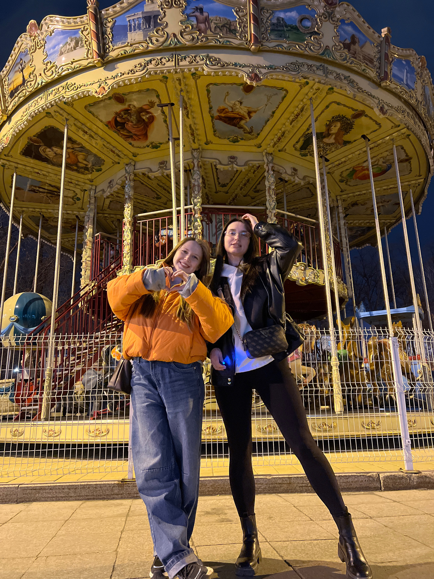 Two young women pose in front of a carousel in Tyumen, Russia. One wears an orange jacket and jeans, making a heart shape with her hands. The other wears a black leather jacket and leggings. The carou…read more