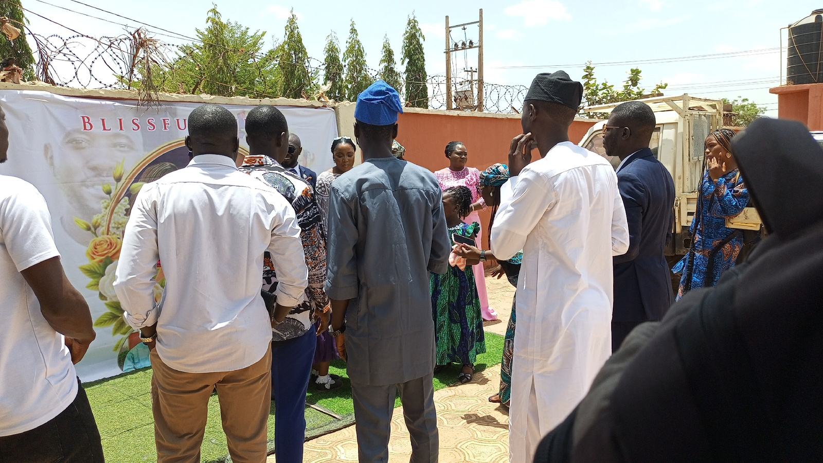 Kakau, Nigeria: A group of approximately 15 people are gathered outdoors near a banner with the word "Blissful" printed on it. The banner also features a photo and is decorated with roses. The people…read more