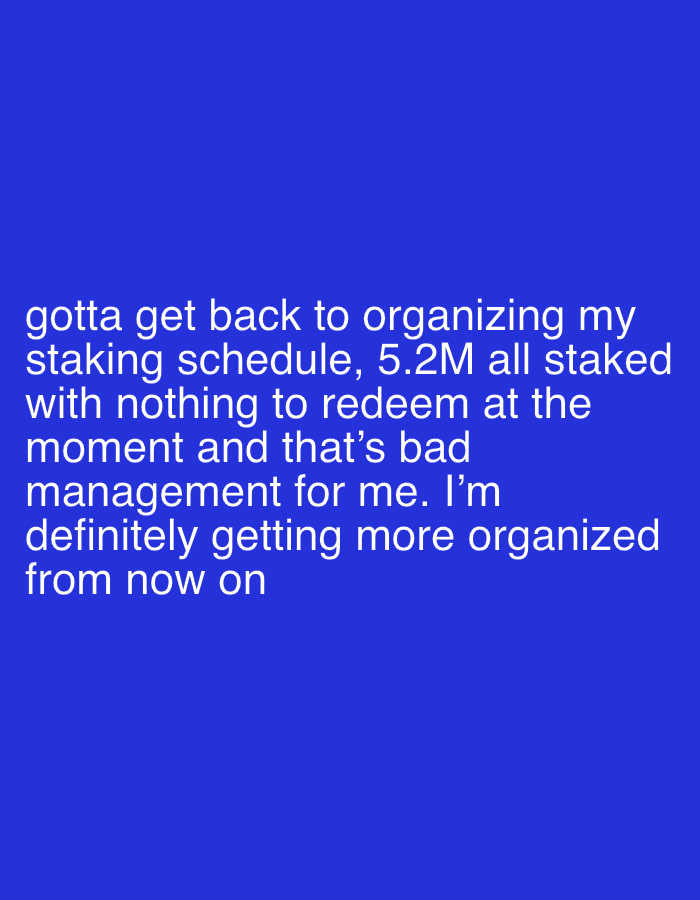 The image is a text-based graphic on a solid blue background. The text is in white and reads: "gotta get back to organizing my staking schedule, 5.2M all staked with nothing to redeem at the moment anβ¦read more