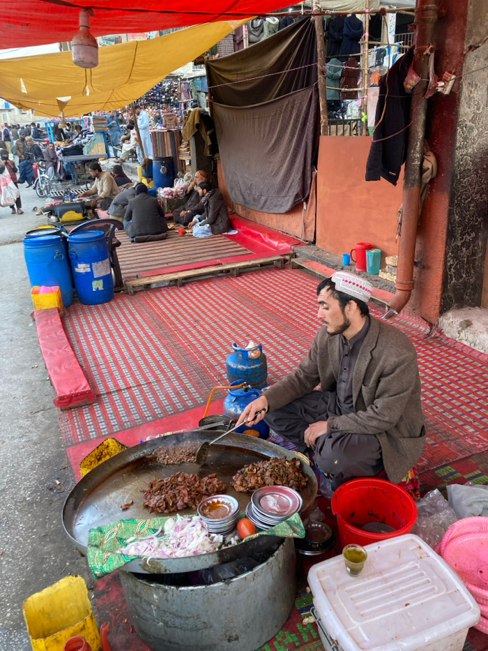 An outdoor market scene is depicted in Quetta City Tehsil, Pakistan. In the foreground, a man, wearing a brown jacket, dark clothing, and a white patterned cap, is crouched on a small red stool. He is…read more