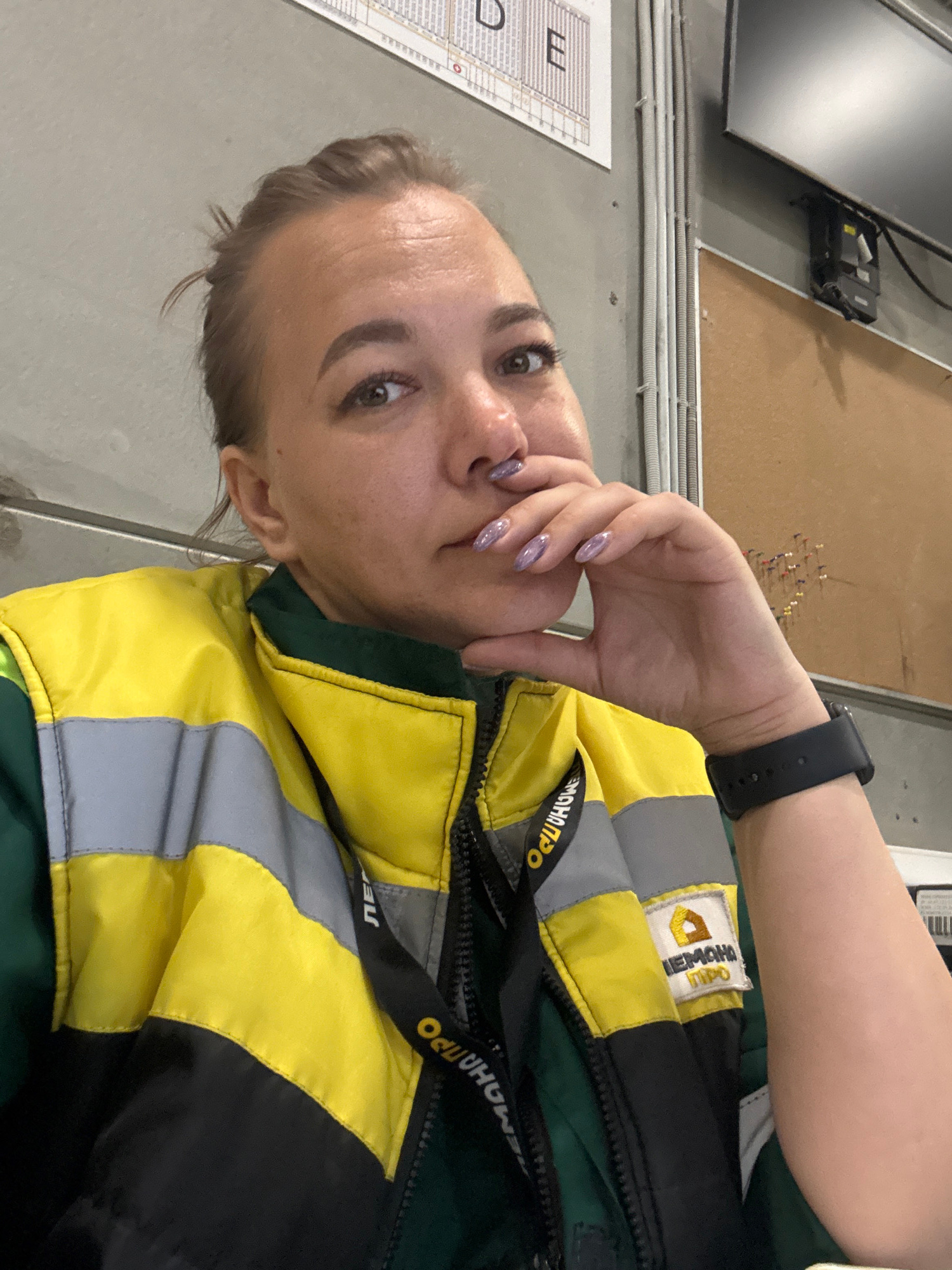 A woman in a yellow and black uniform is indoors. The uniform has a patch in Cyrillic script that reads "LEMONA NPO." A lanyard with "OMAHANPO" is around her neck. She has lavender-colored nails and iā¦read more