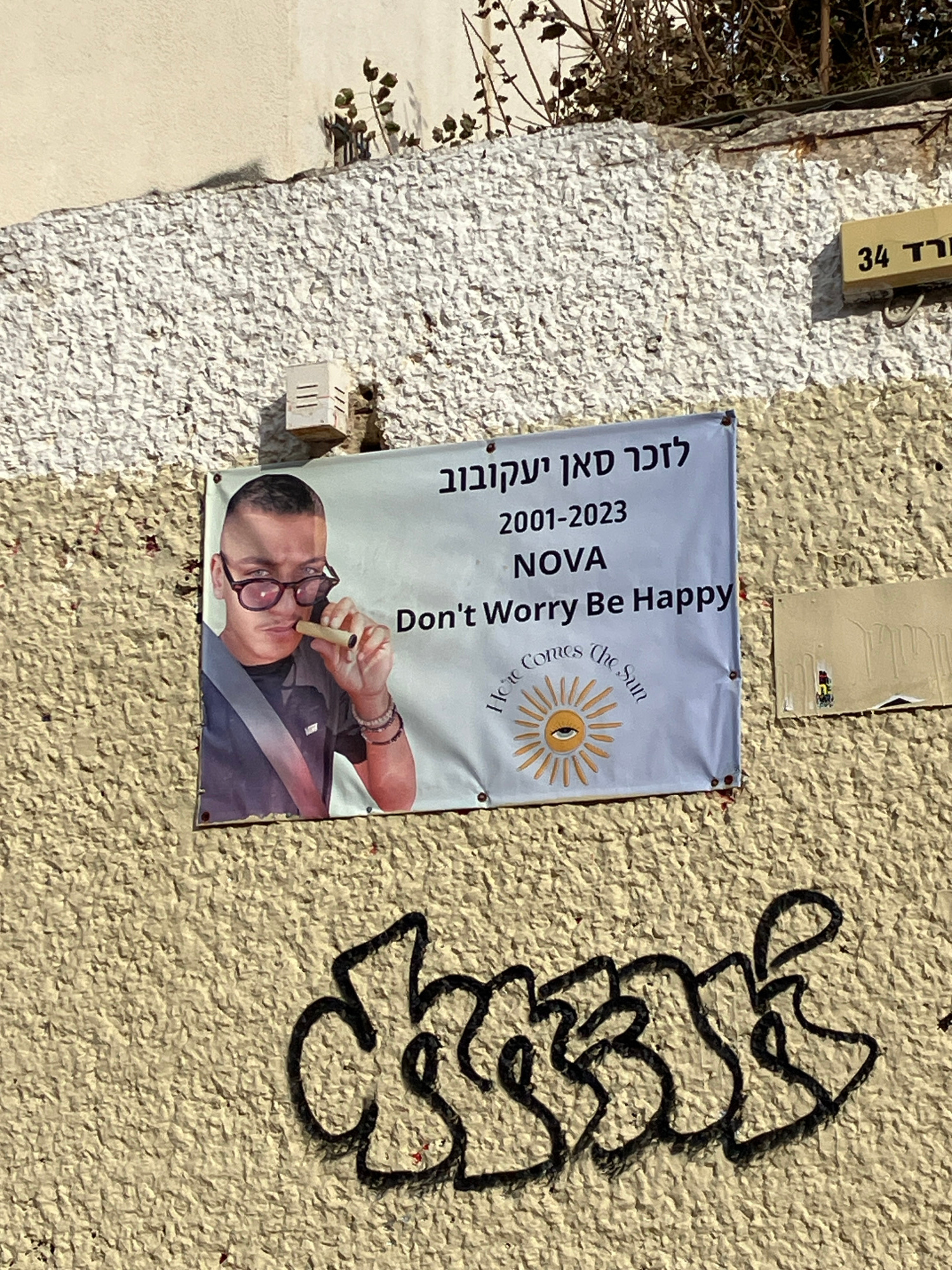 A light-colored, rectangular memorial banner is affixed to a textured building wall in Tel-Aviv, Israel, specifically at an address identifiable as "Vered 34" via a brown plaque in the upper right. Th…read more
