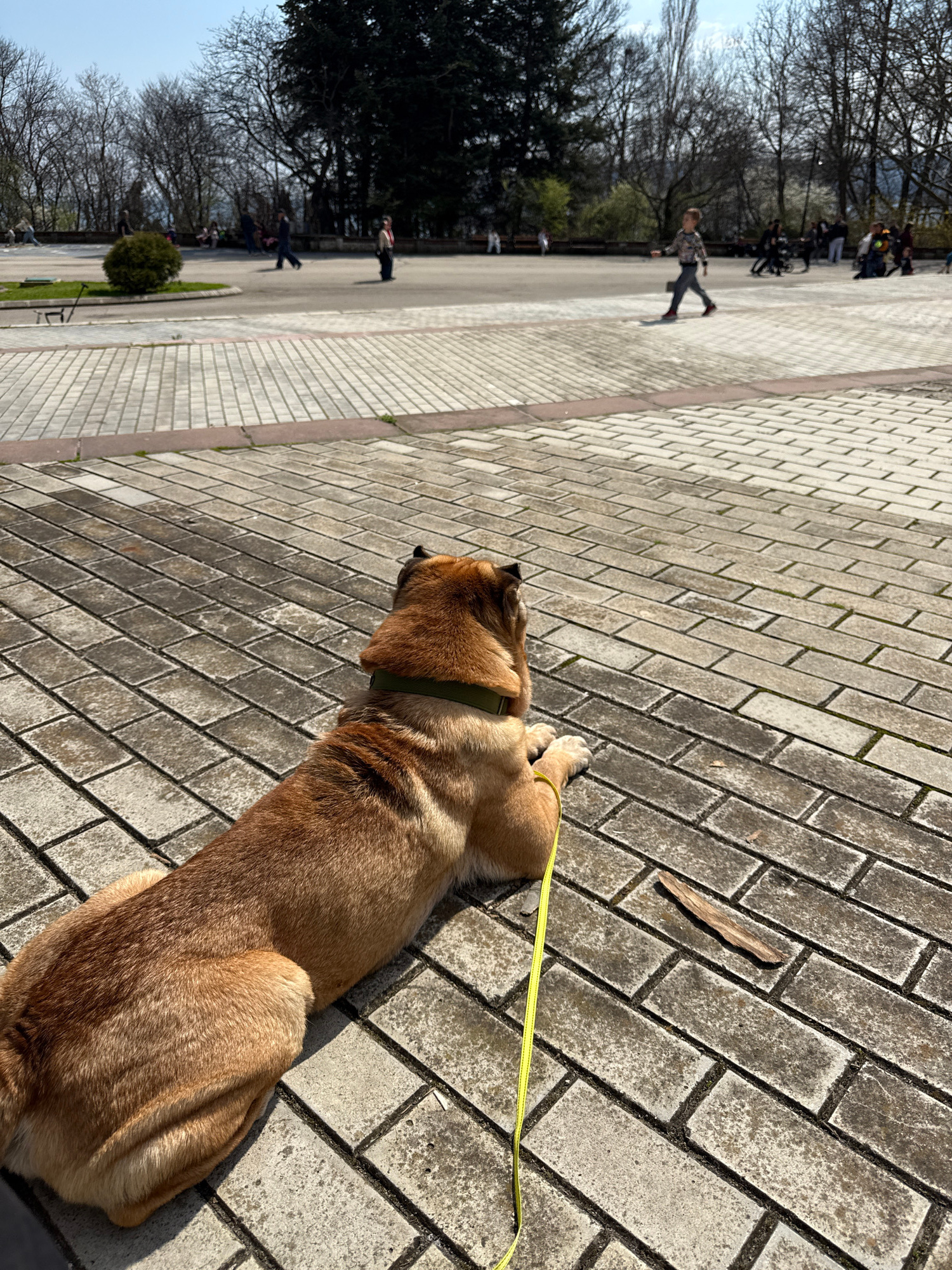 A dog with a yellow leash lies on a brick paved area. There are people and trees in the background. This location is in Varna, Bulgaria.