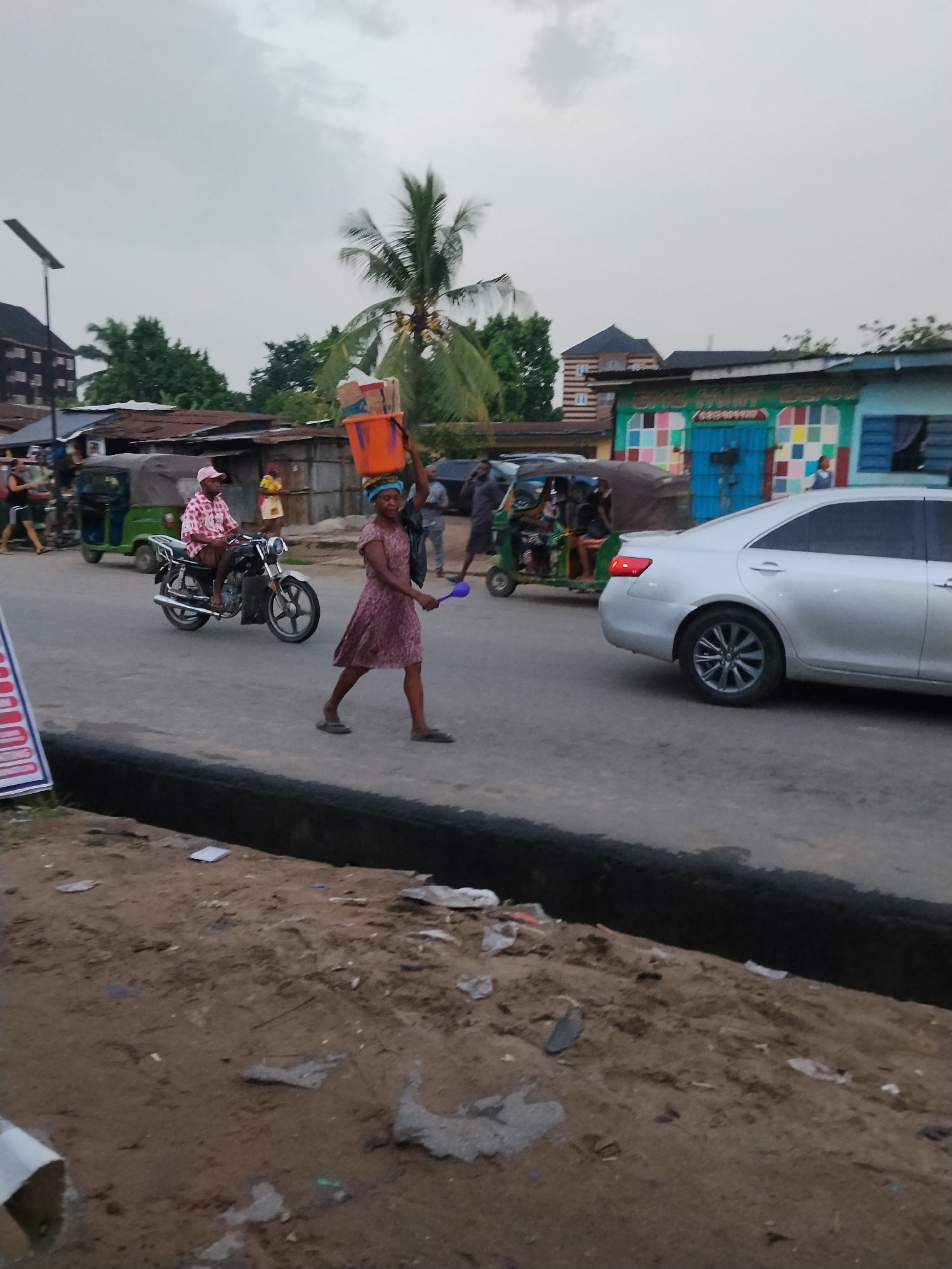 The image depicts a street scene in Aba, Nigeria. A woman is walking across the street, carrying an orange bucket on her head and holding a blue spoon in her right hand. She is wearing a floral dressβ¦read more