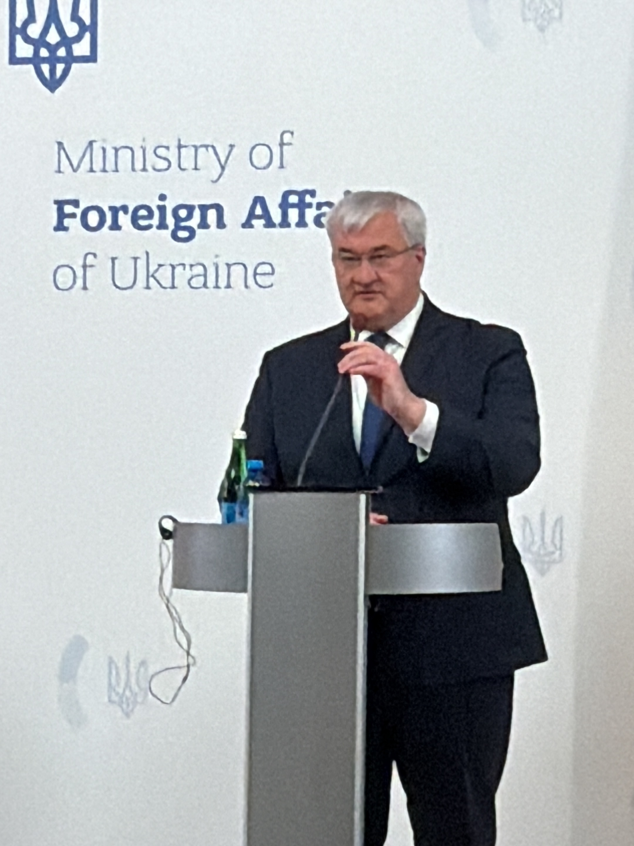 A man is standing at a podium in front of a wall displaying the emblem and text "Ministry of Foreign Affairs of Ukraine." The podium has a microphone and a bottle of water. The man is speaking, holdinβ¦read more