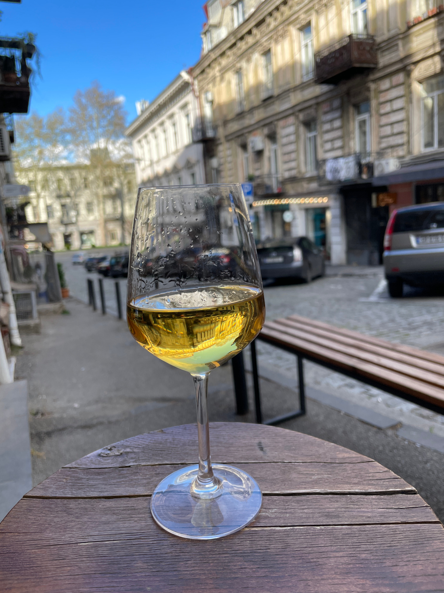 A wine glass filled with a light-colored liquid rests on a round, wooden tabletop outside in Tbilisi, Georgia. The background shows European-style buildings and a street with parked cars and pedestria…read more