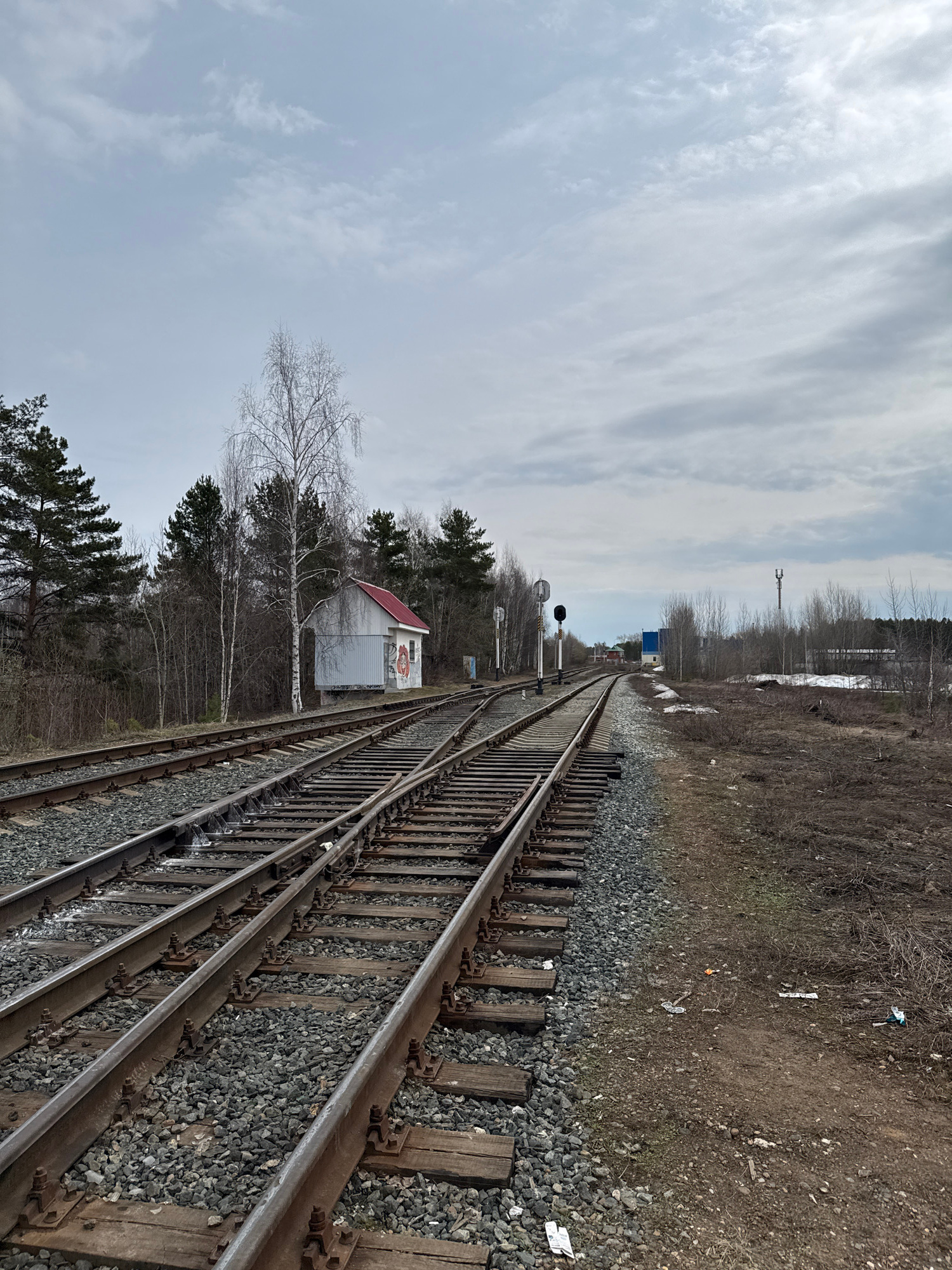 A landscape photograph depicts a railway track converging with another, viewed from a slightly elevated perspective in Unknown, Unknown. The railway is set against a backdrop of dense trees. A small,…read more