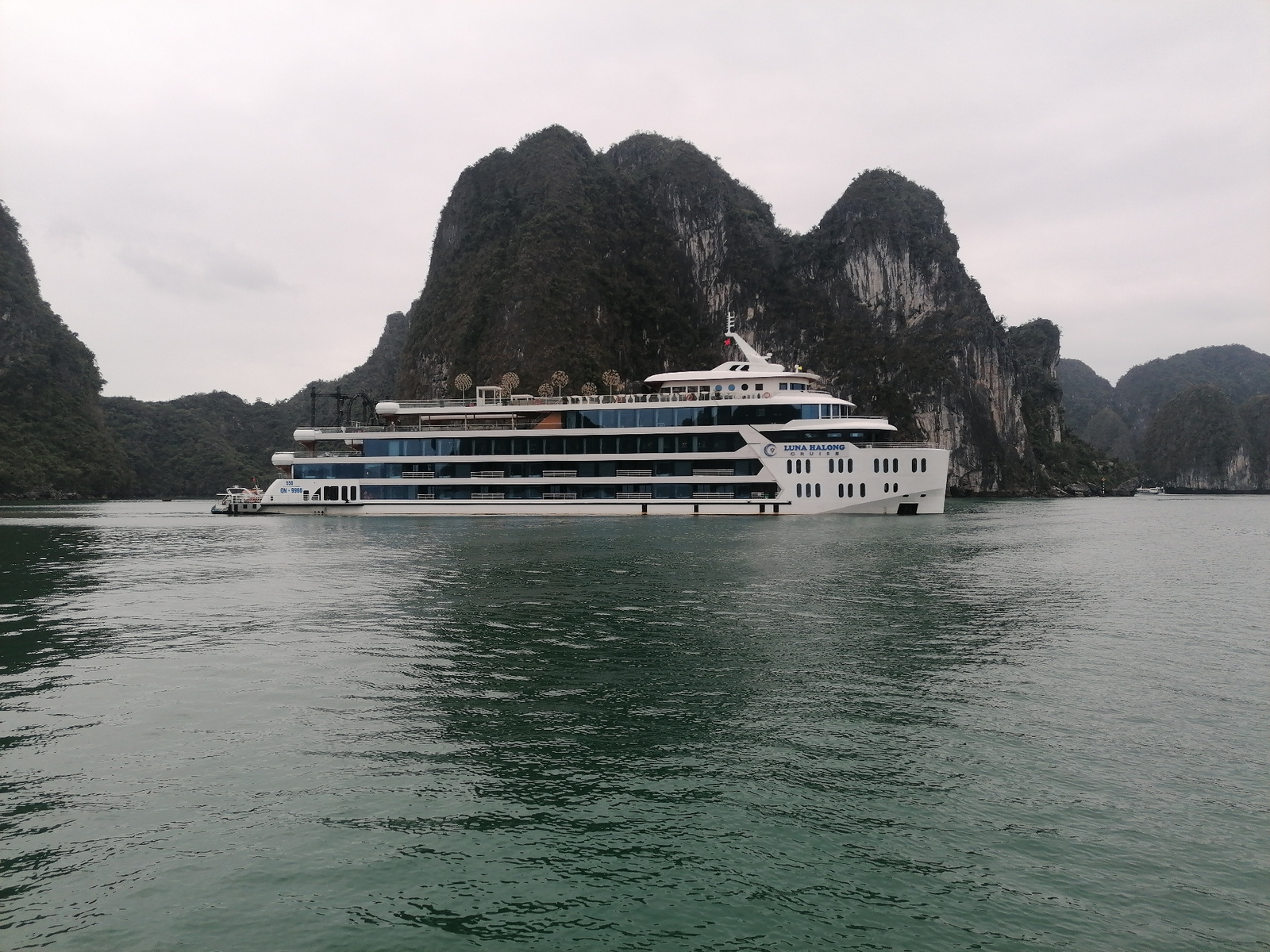 This media file depicts a tranquil waterscape featuring a large, modern cruise ship navigating or anchored amidst distinctive natural scenery. The central subject is a multi-deck white cruise ship wit…read more